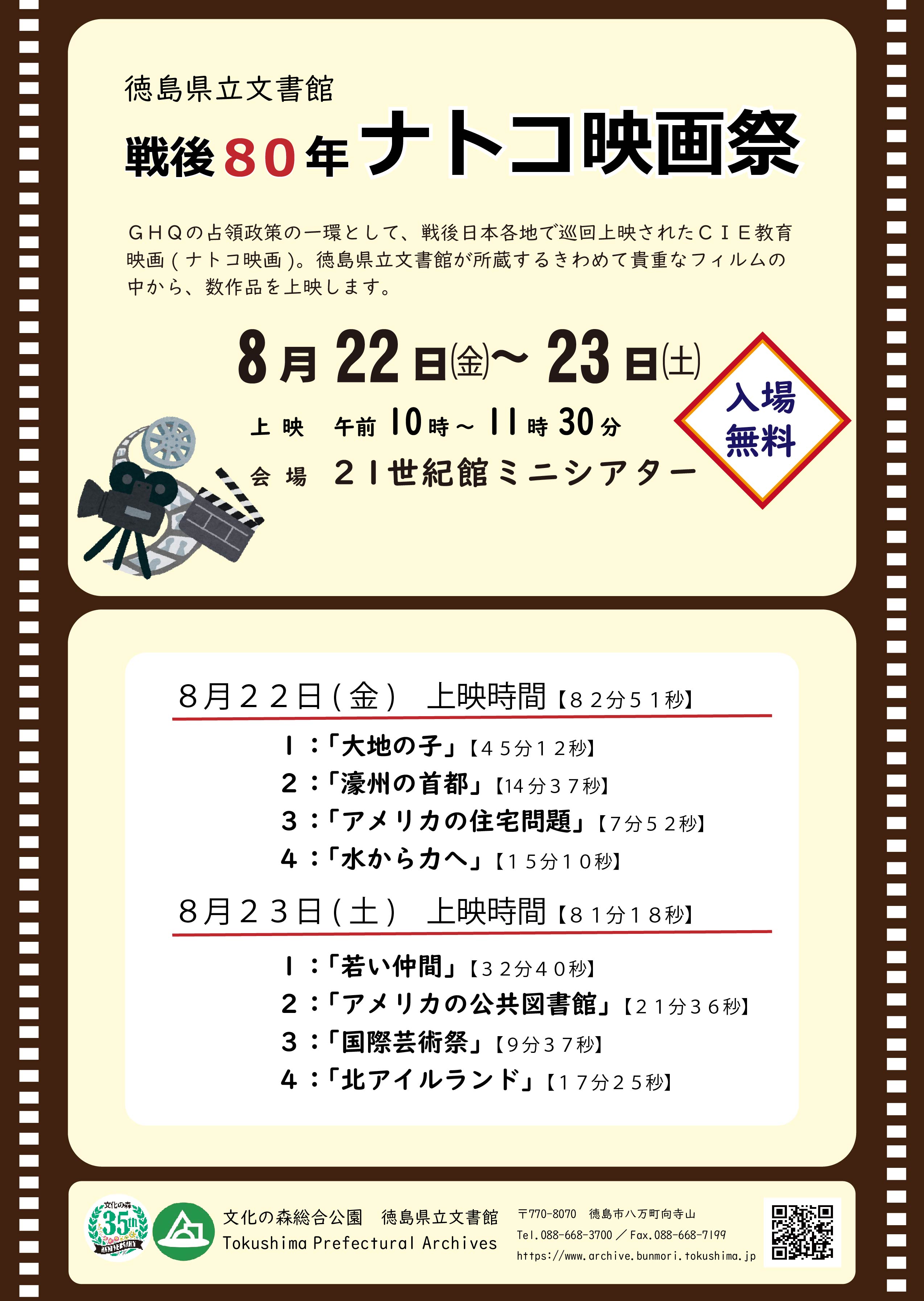 GHQの占領政策の一環として、戦後日本各地で巡回上映されたCIE教育映画(ナトコ映画)。徳島県立文書館が所蔵するきわめて貴重なフィルムの中から、数作品を上映します。