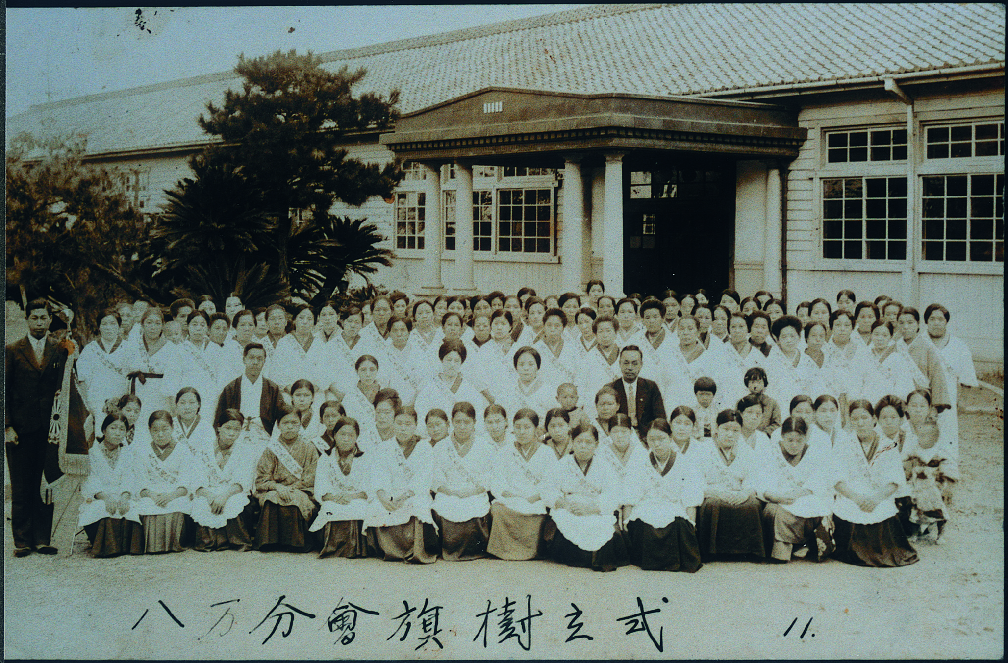 タイトル:『国防婦人会八万分会旗樹立式 八幡小学校の前』