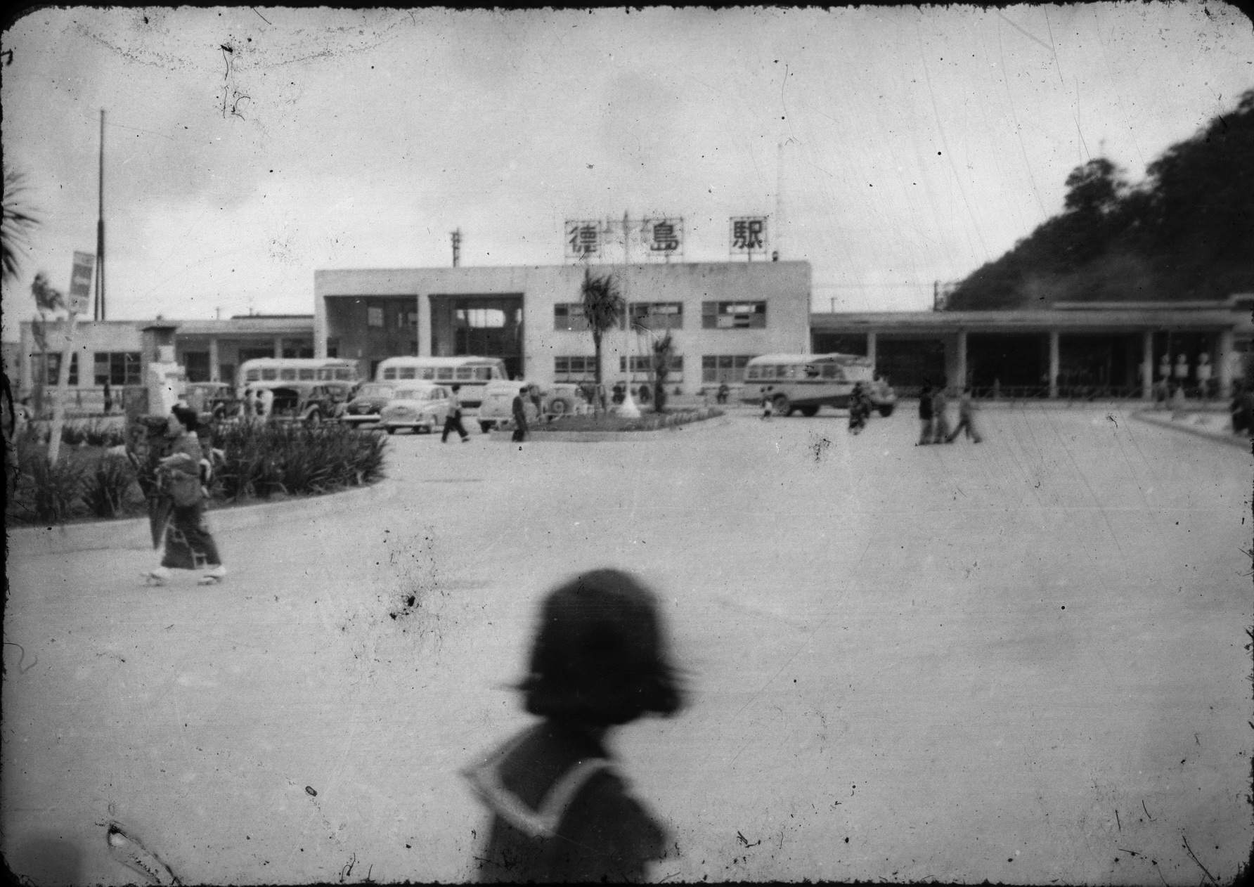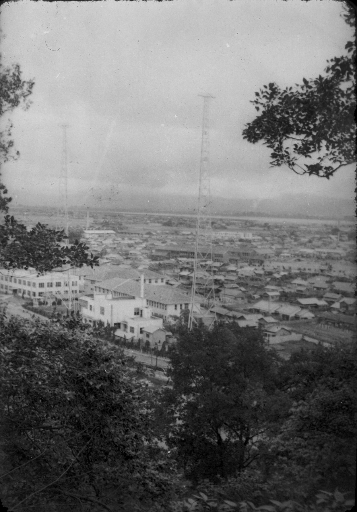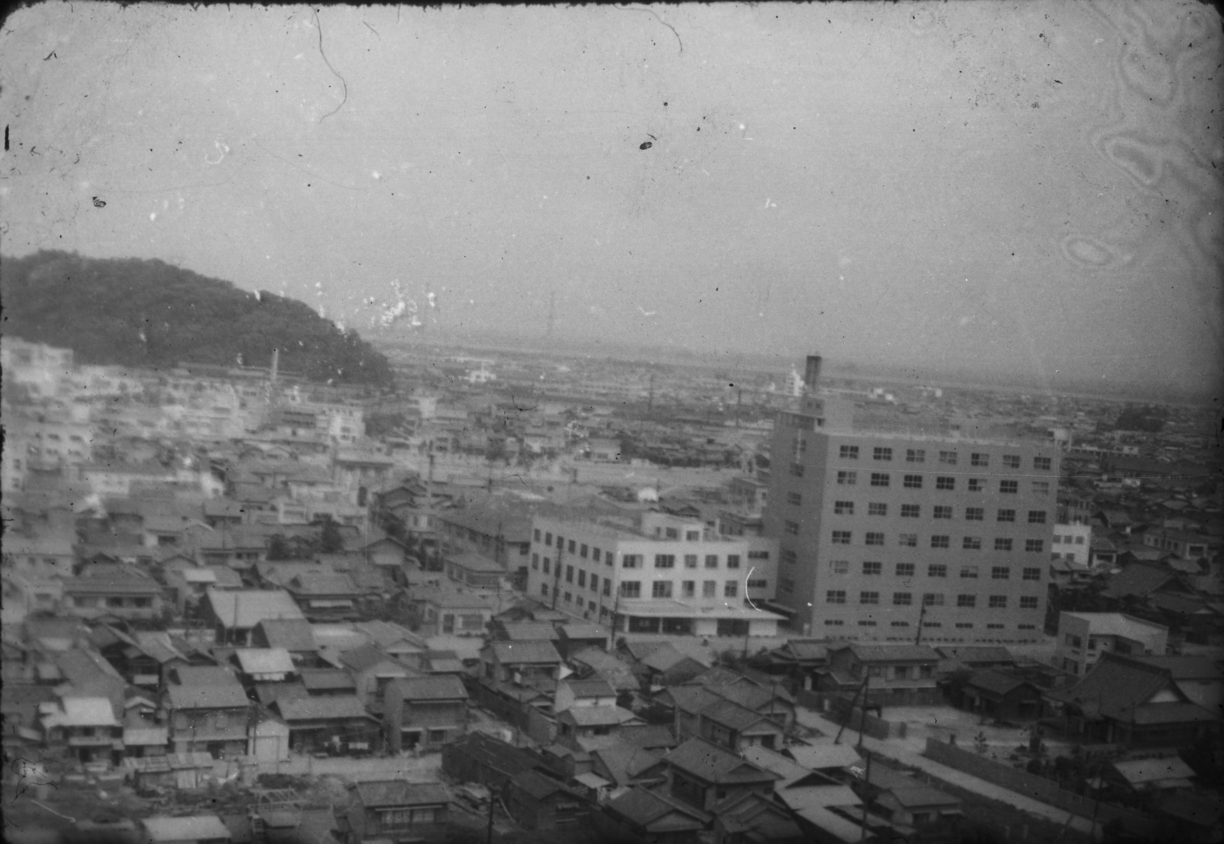 タイトル:『日峰山から小松島市街地を望む・煙突は火力発電所(現市役所)、手前白い建物は日赤』