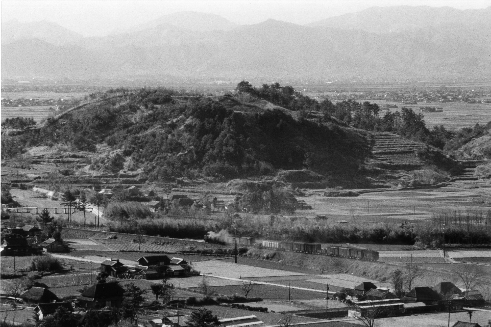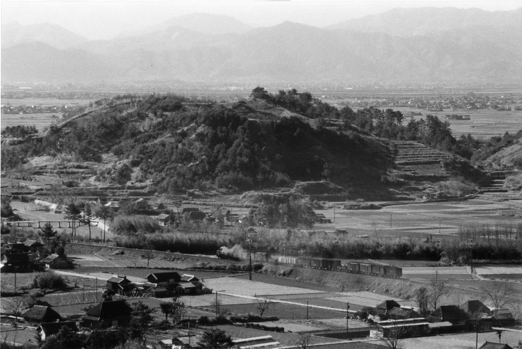 タイトル:『高尾山中腹から・韓崇山とSLが牽引する高徳線下りの貨物列車』