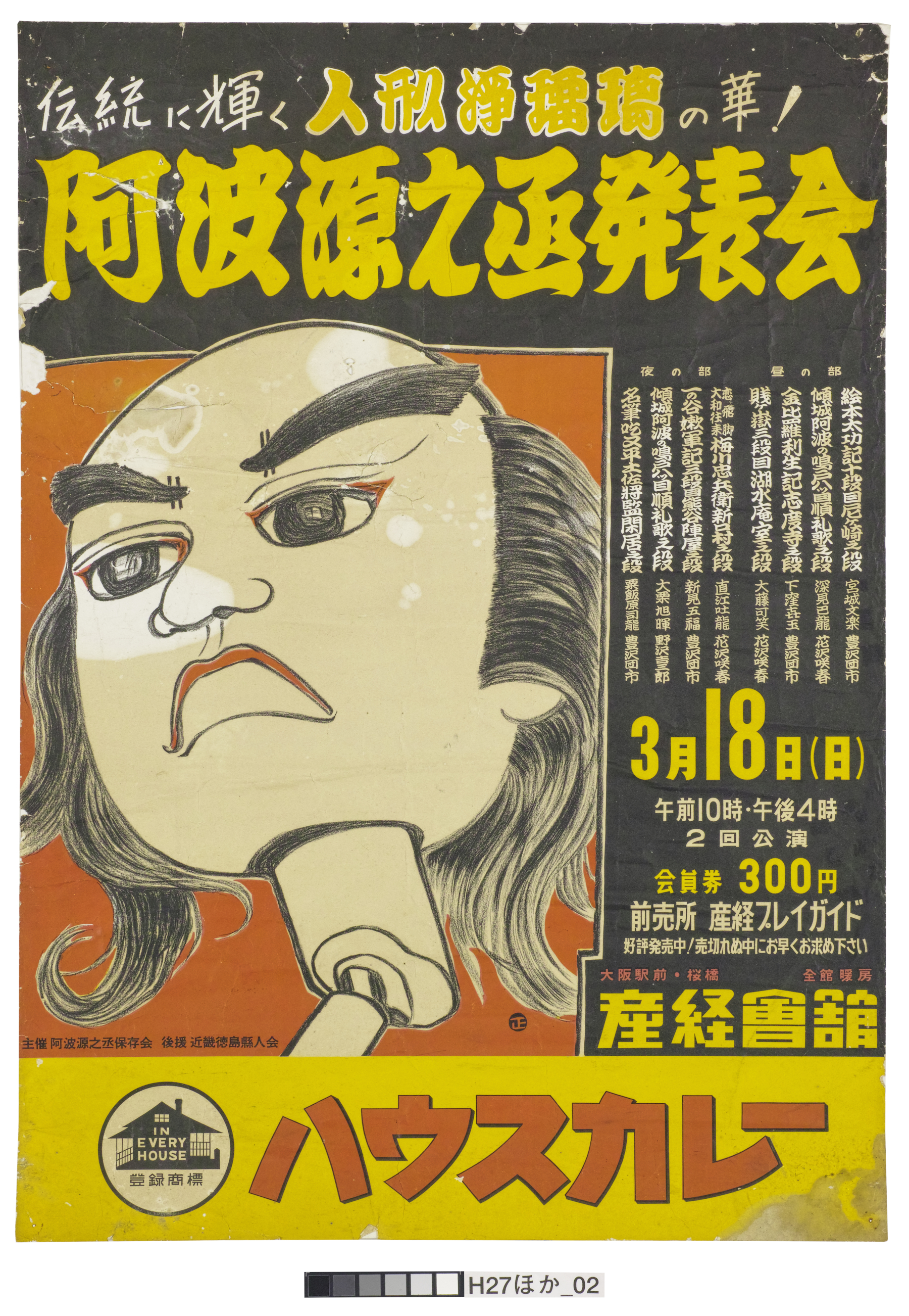 タイトル:『ポスター:ハウスカレー 阿波源之丞発表会 人形浄瑠璃の頭画 大阪駅前・桜橋』