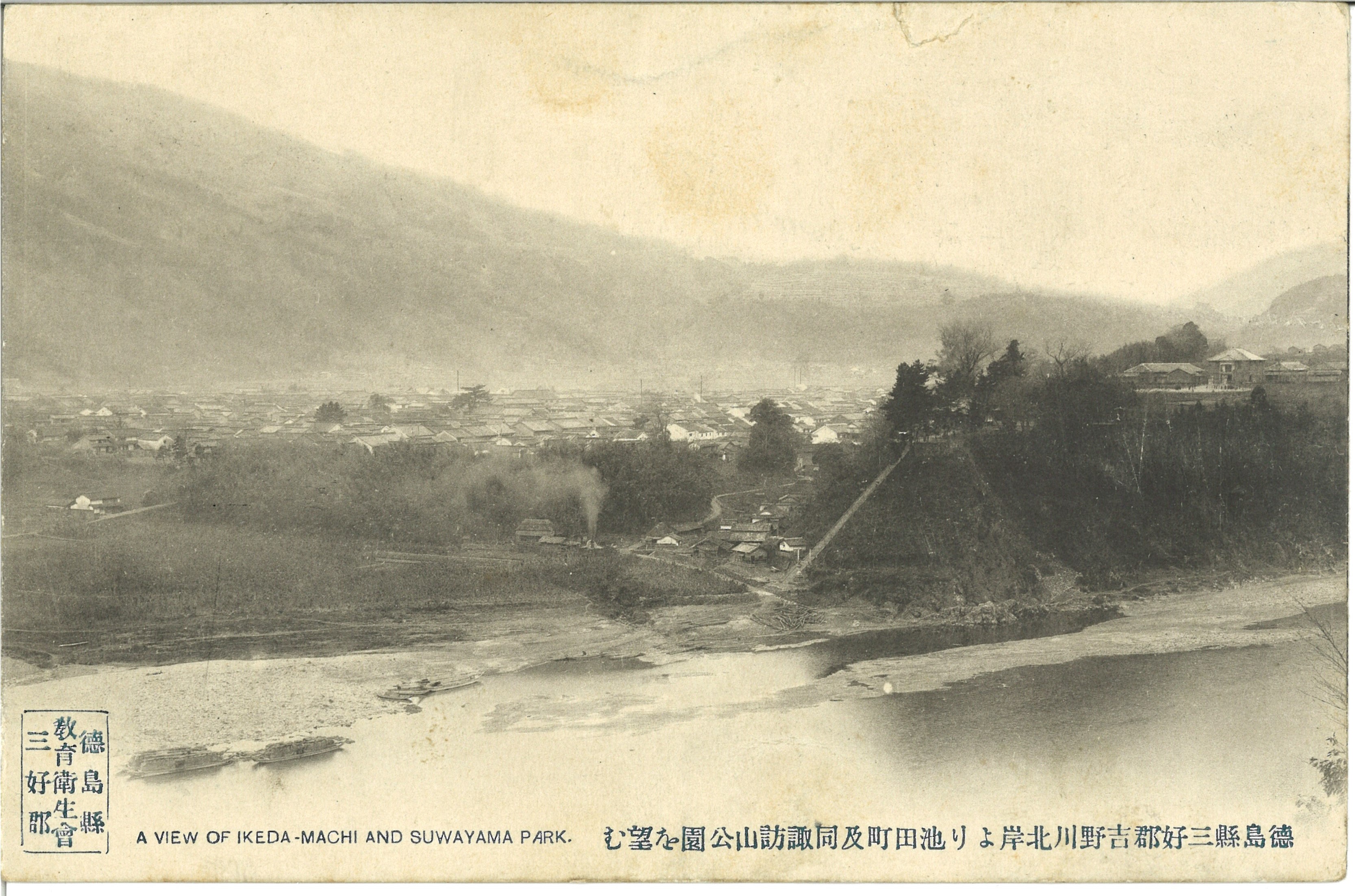 徳島県三好郡吉野川北岸より池田町及び諏訪公園を望む