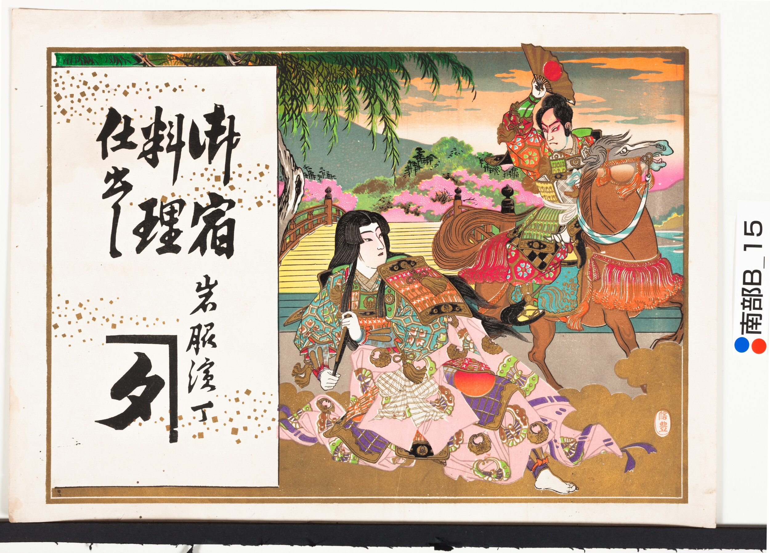 引札絵柄:歌舞伎の場面(巴御前か?) 商店場所:岩脇浜丁 商店名称:屋号(「タ) 商売内容:御宿料理仕出し