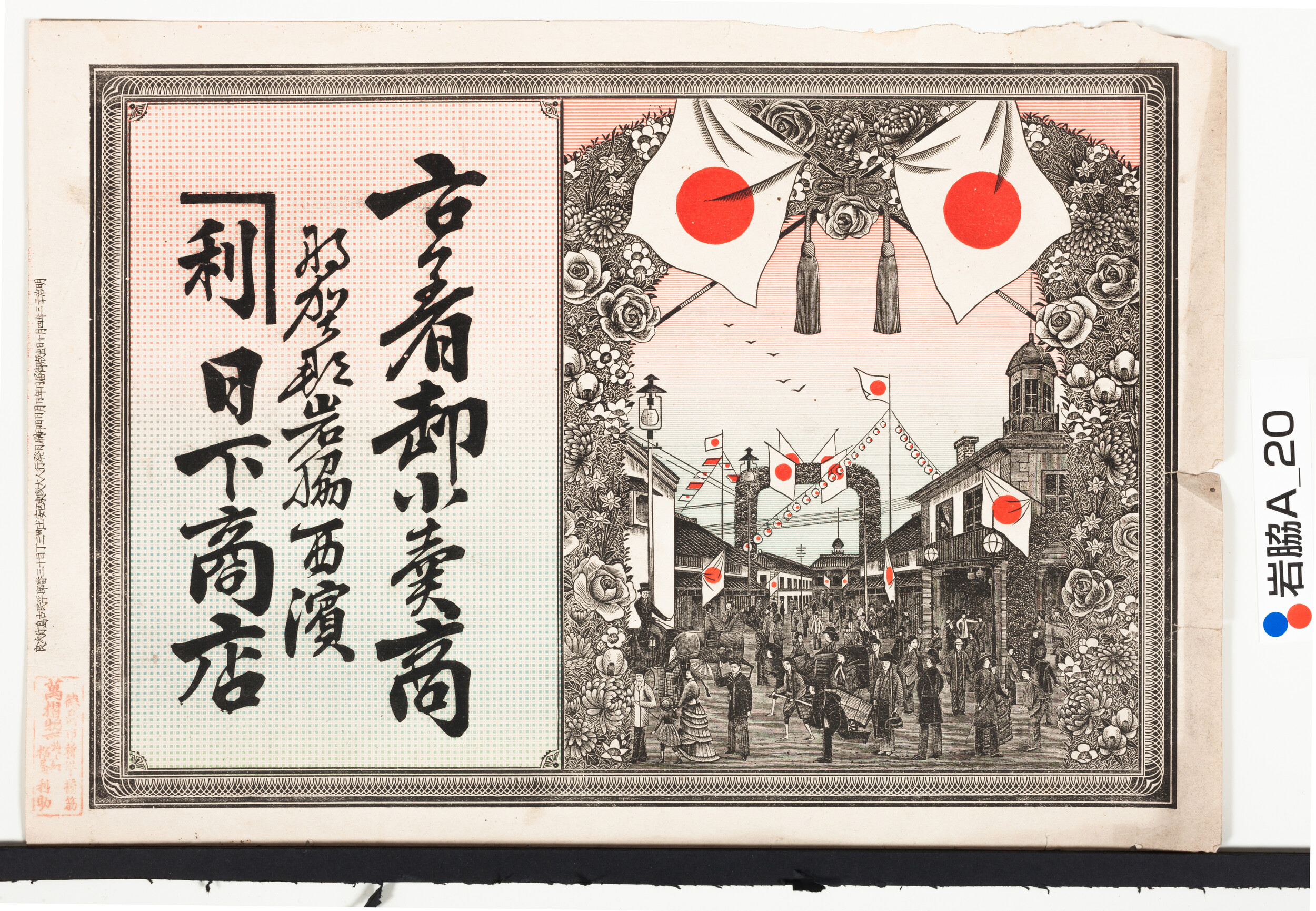 引札絵柄:国旗掲揚 街を行き交う人々 商店場所:那賀郡岩脇西浜 商店名称:日下商店 商売内容:古着卸小売商