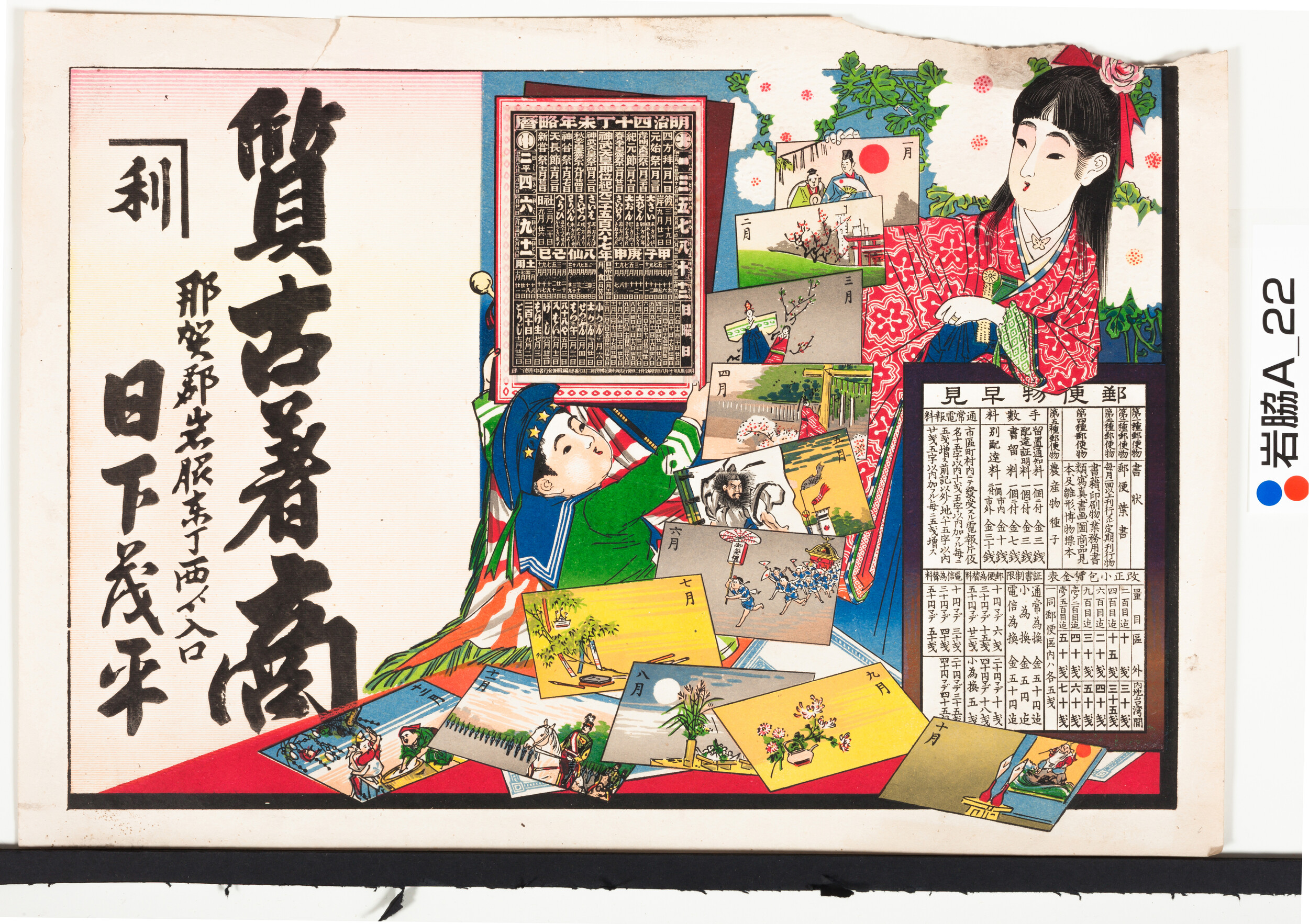 引札暦:明治40年略暦・郵便物早見表(カレンダーを持つ兄弟) 商店場所:那賀郡岩脇東丁西より入口 商店名称:日下茂平 商売内容:質古着商