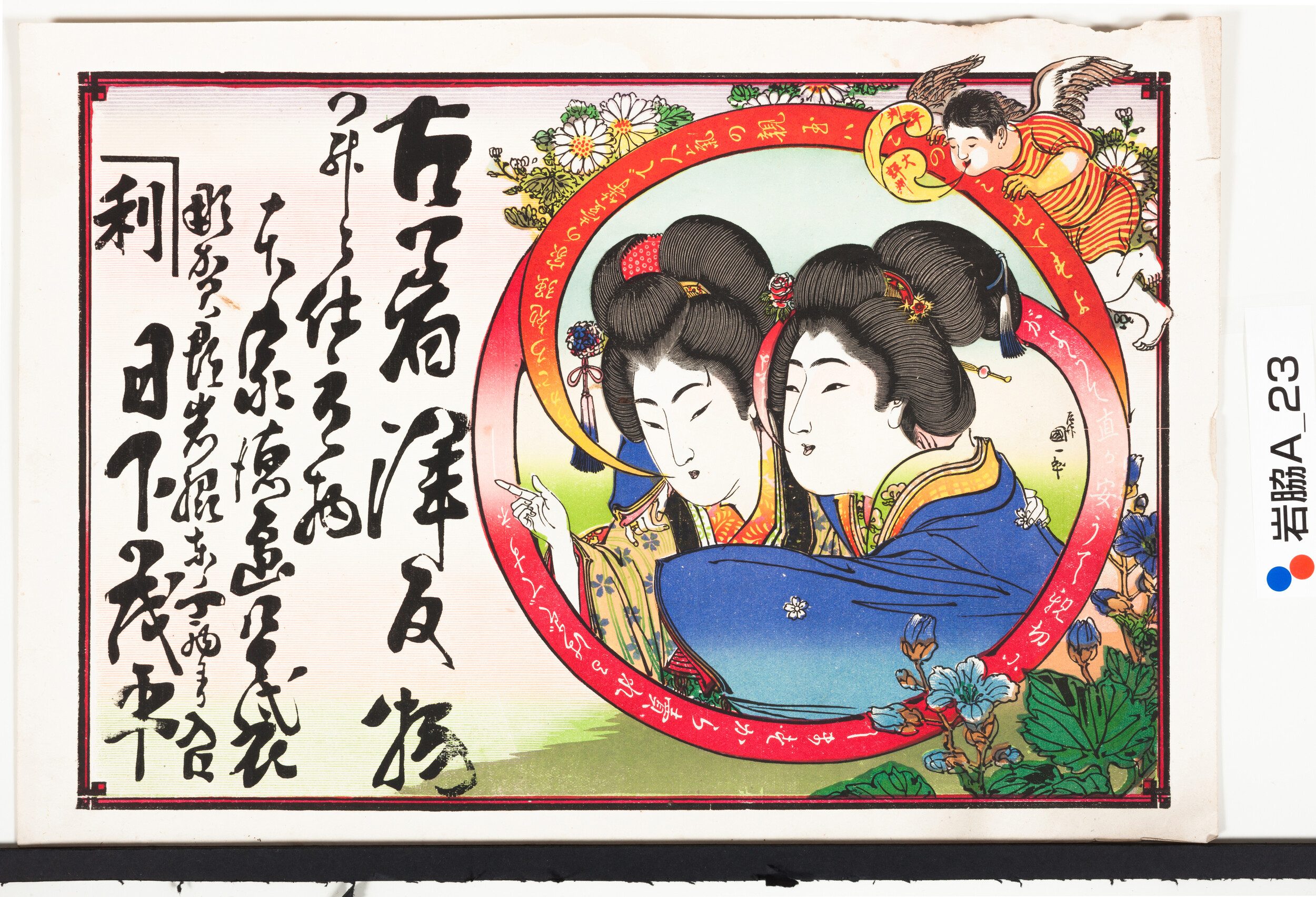 引札絵柄:2人の美人 商店場所:那賀郡岩脇東ノ丁西より入口 商店名称:日下茂平 商売内容:古着洋反物并ニ仕立物
