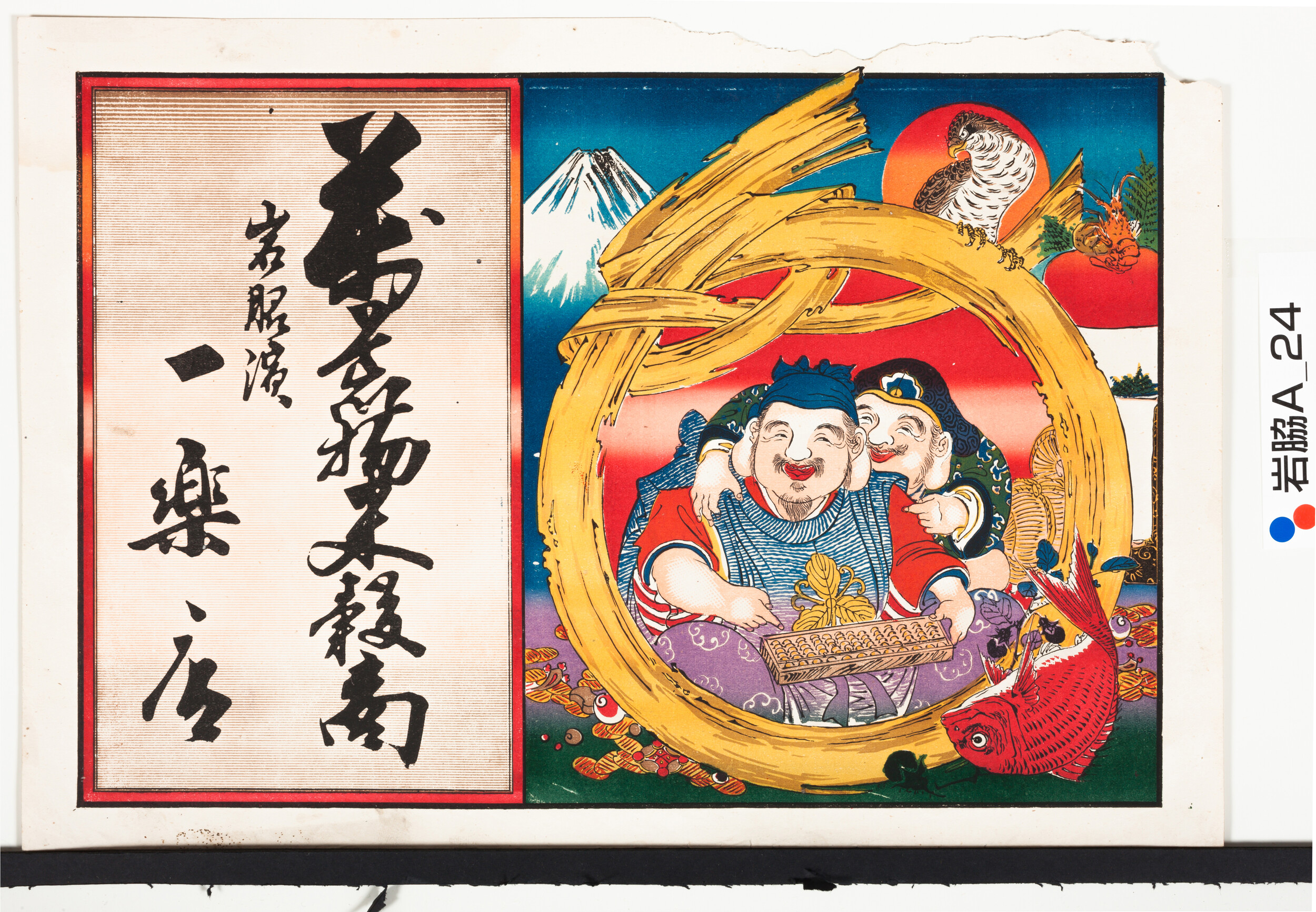 引札絵柄:宝珠に見立てた丸に恵比須(算盤)大黒 商店場所:岩脇浜 商店名称:一楽店 商売内容:萬荒物米穀商