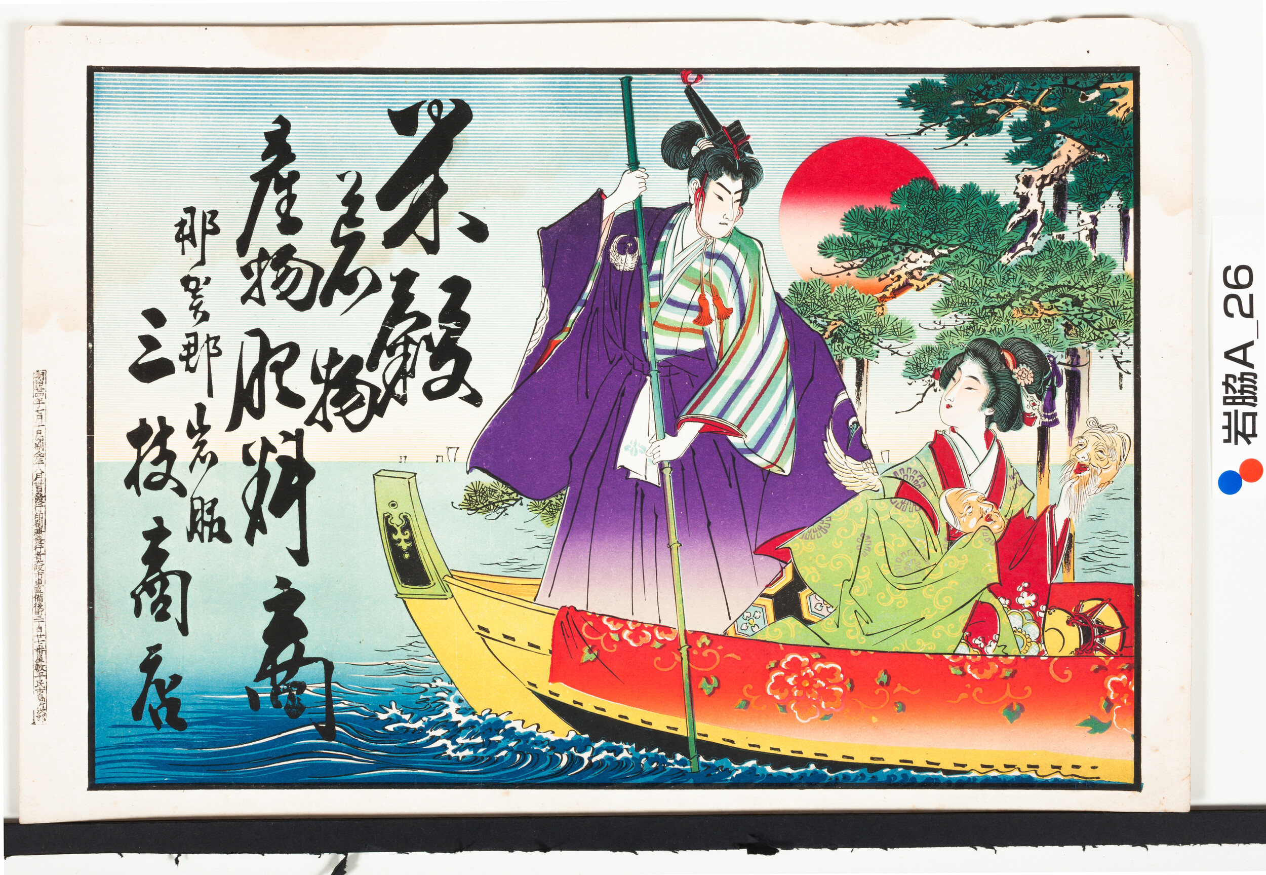 引札絵柄:船上の男(艪を漕ぐ)女(高砂老夫婦のお面を持つ) 商店場所:那賀郡岩脇 商店名称:三枝商店 商売内容:米穀荒物産物肥料商