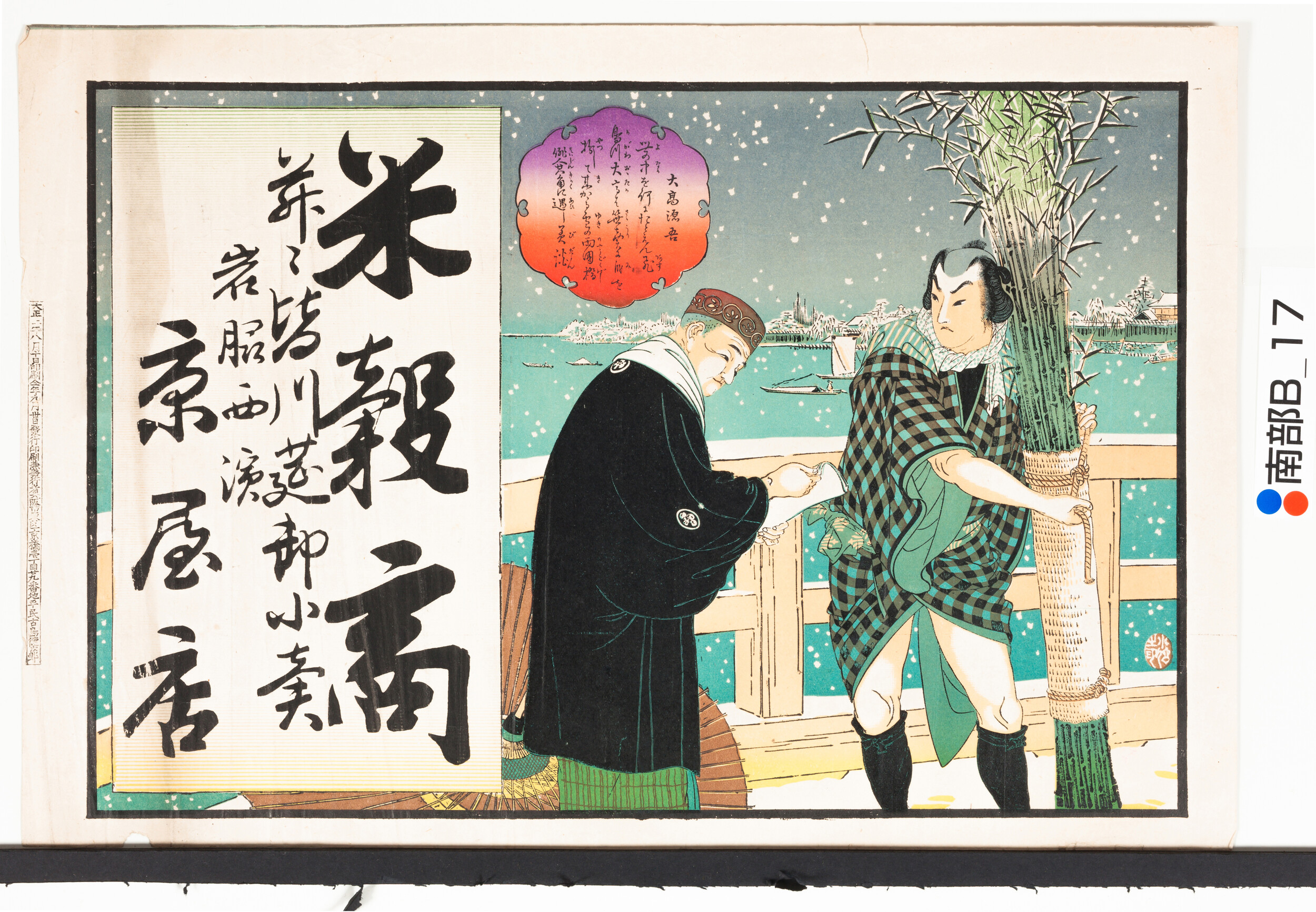 引札絵柄:両国橋上の大高源吾(笹売り)と其角 商店場所:岩脇西浜 商店名称:京屋店 商売内容:米穀商并ニ皆川筵卸小売