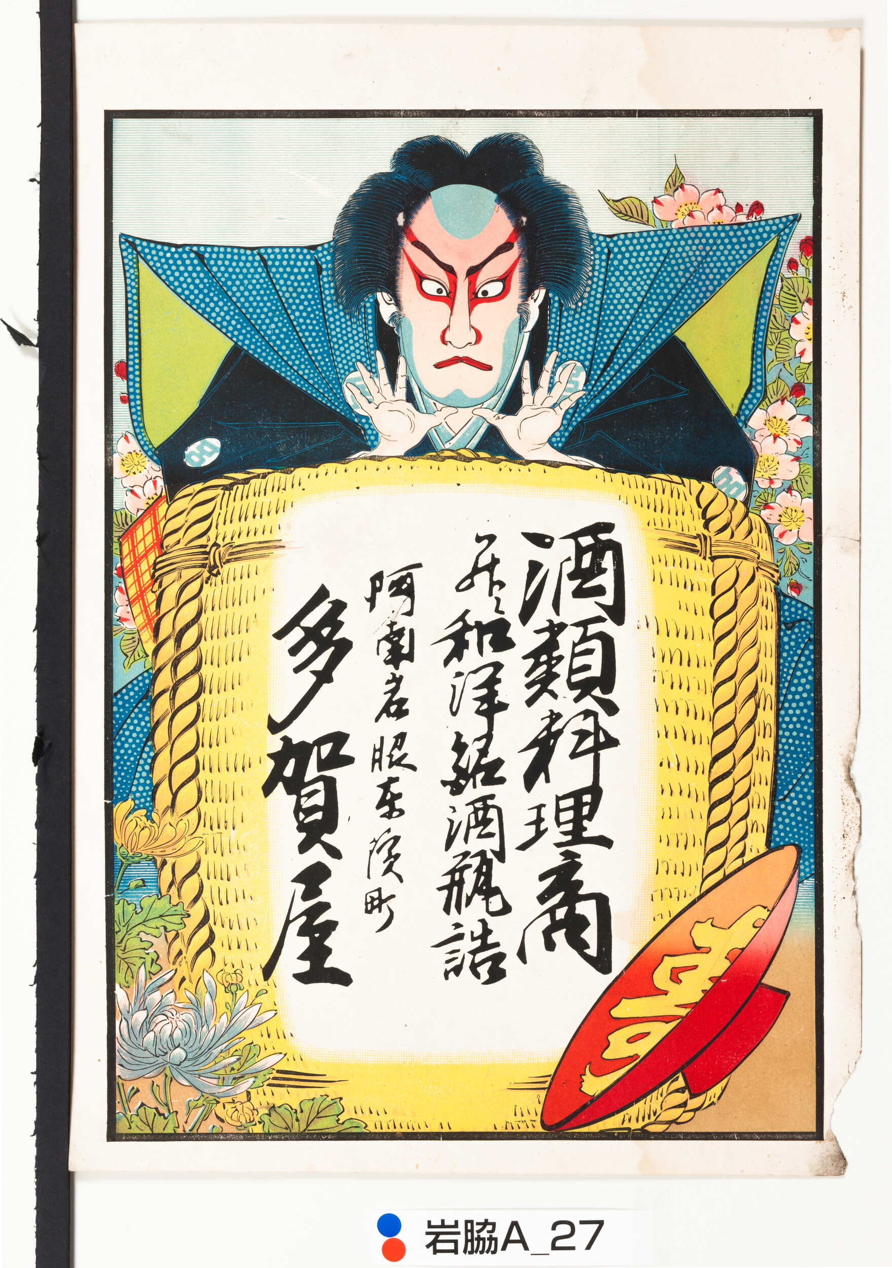 引札絵柄:酒樽の上に隈取りをした歌舞伎役者 壽の字の盃 商店場所:阿南岩脇東浜町 商店名称:多賀屋 商売内容:酒類料理商并ニ和洋銘酒瓶詰