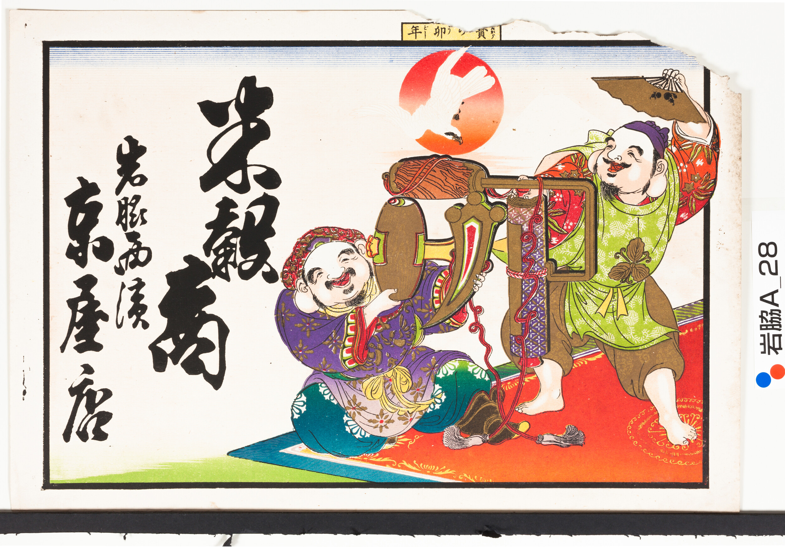 引札絵柄:恵比須大黒 上中央に「宝の卯年」 商店場所:岩脇西浜 商店名称:京屋店 商売内容:米穀商