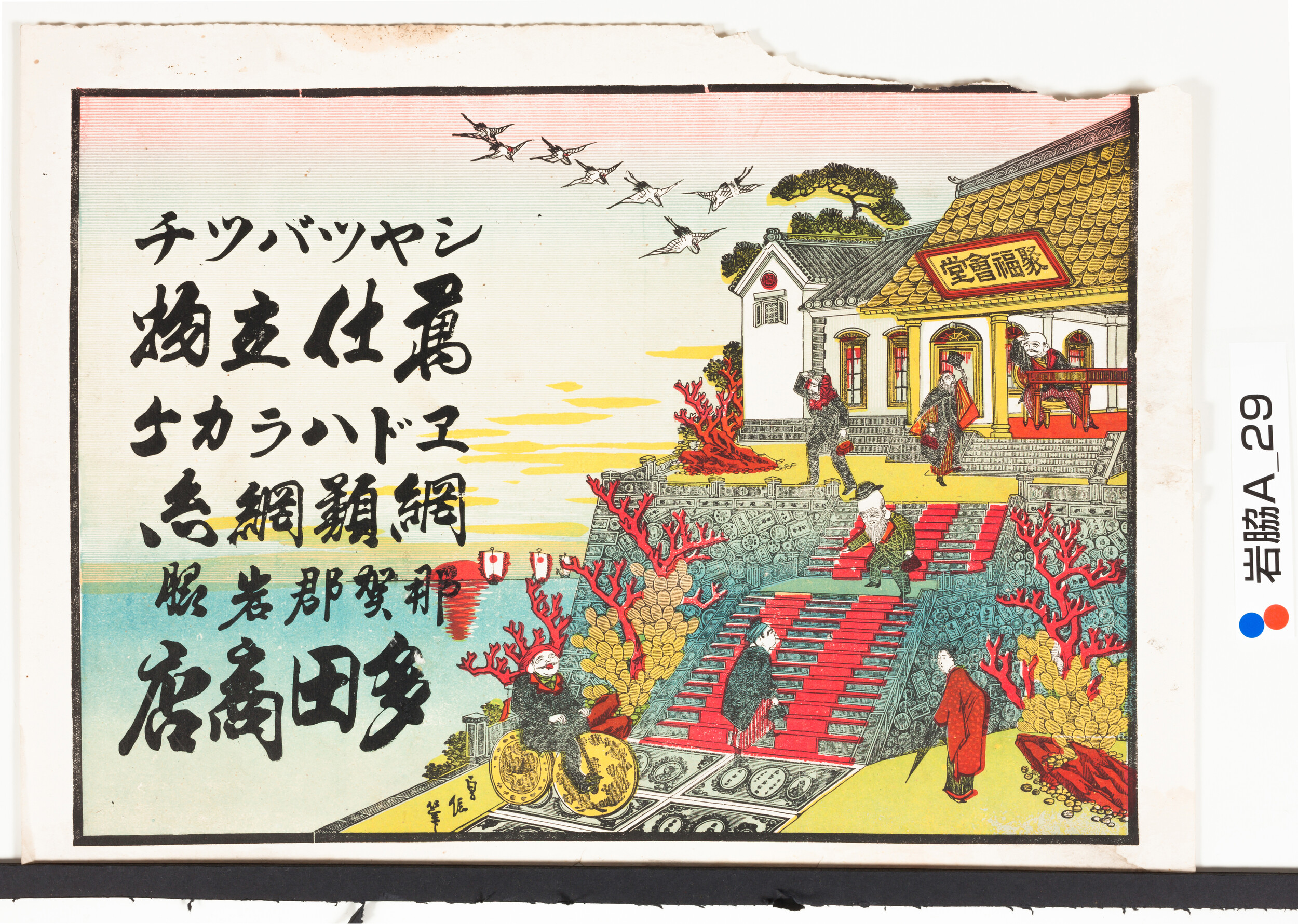 引札絵柄:看板「聚福会堂」の絵 商店場所:那賀郡岩脇 商店名称:多田商店 商売内容:シャツバッチ 萬仕立物 エドハラカケ 網類網糸