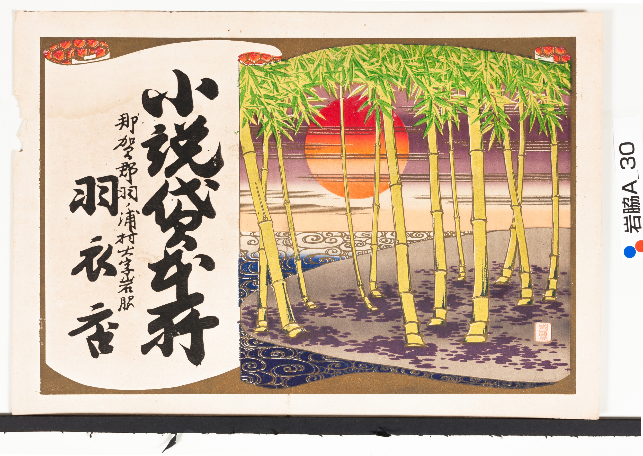 引札絵柄:旭に竹林 商店場所:那賀郡羽ノ浦村大字岩脇 商店名称:羽衣店 商売内容:小説貸本所