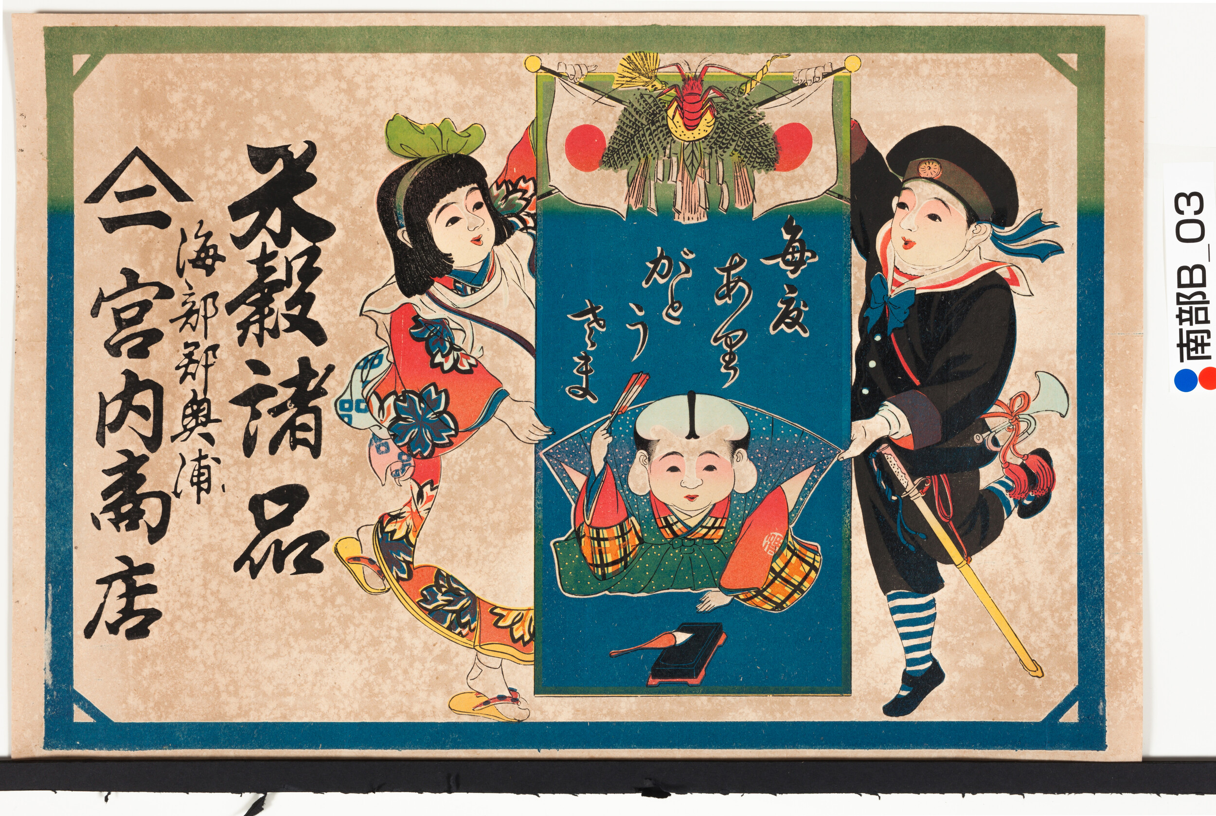 引札絵柄:福助(毎度ありがとうさま) 商店場所:海部郡奥浦 商店名称:宮内商店 商売内容:米穀諸品