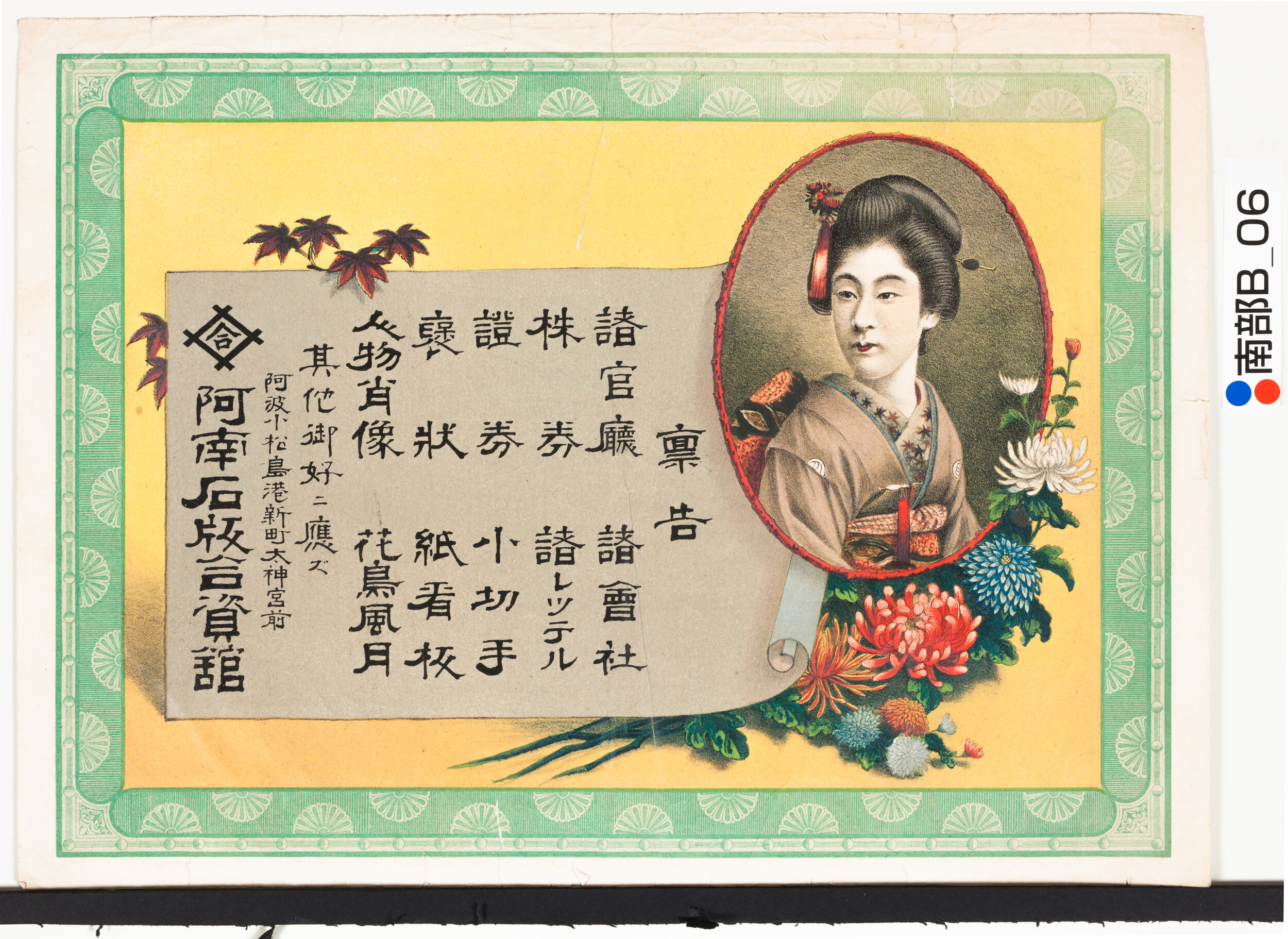 引札絵柄:女性肖像画 稟告 諸官庁 諸会社 株券諸レッテル等と記載 商店場所:阿波小松島港新町太神宮前 商店名称:阿南石版合資館 商売内容:石版