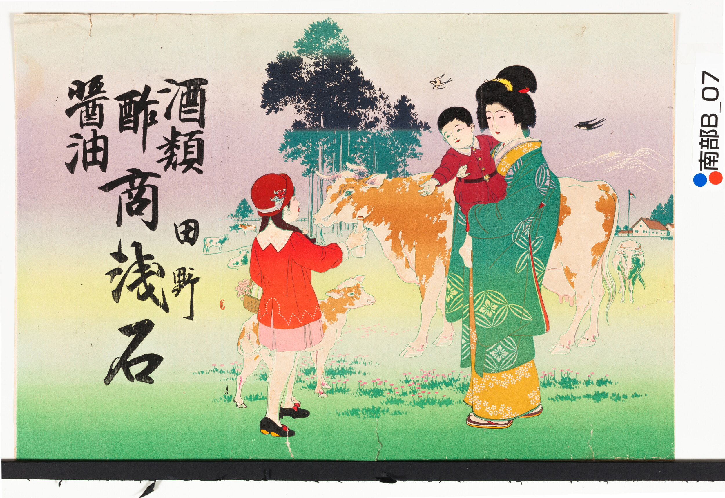 引札絵柄:牧場での母子の様子 商店場所:田野 商店名称:浅石 商売内容:酒類、酢、醤