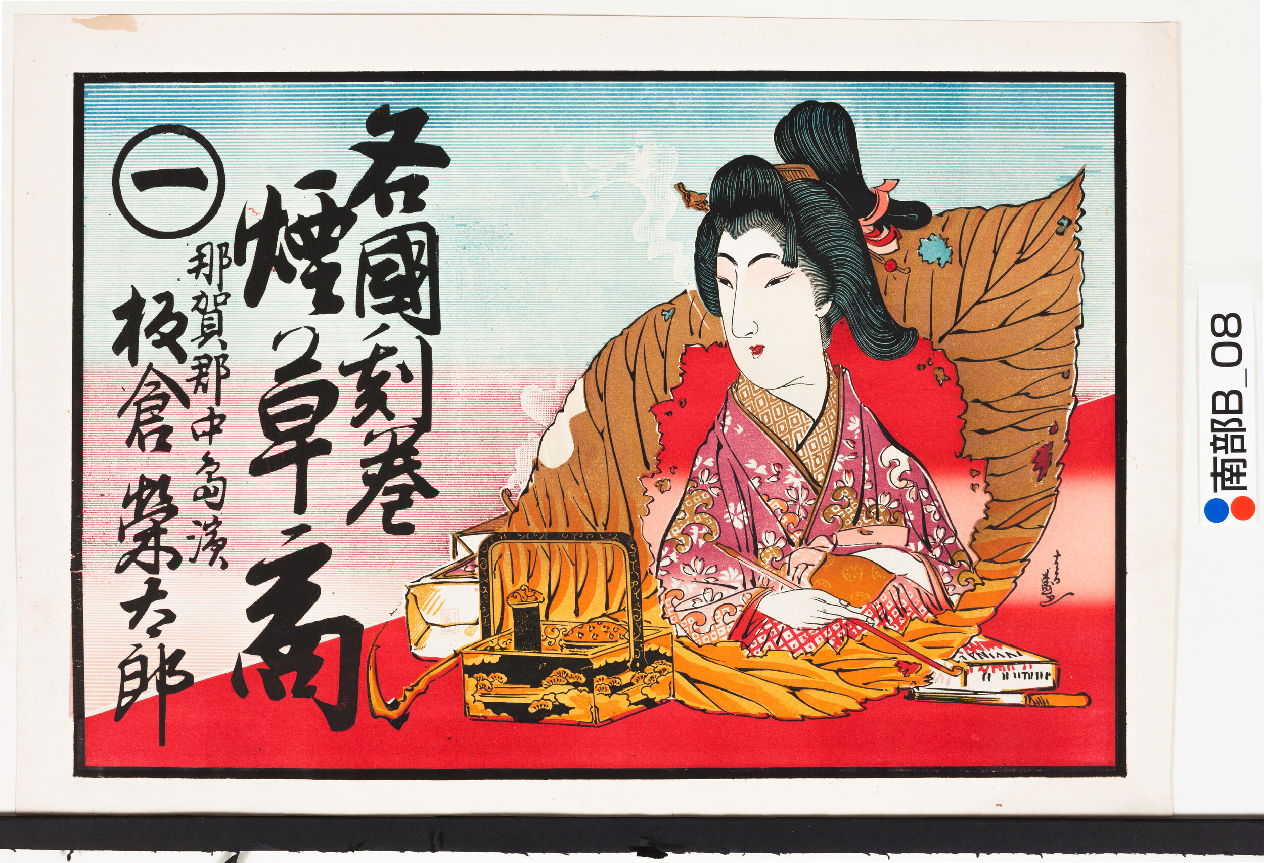 引札絵柄:キセルを持つ女性 商店場所:那賀郡中島浜 商店名称:板倉栄太郎 商売内容:各国刻巻 煙草商