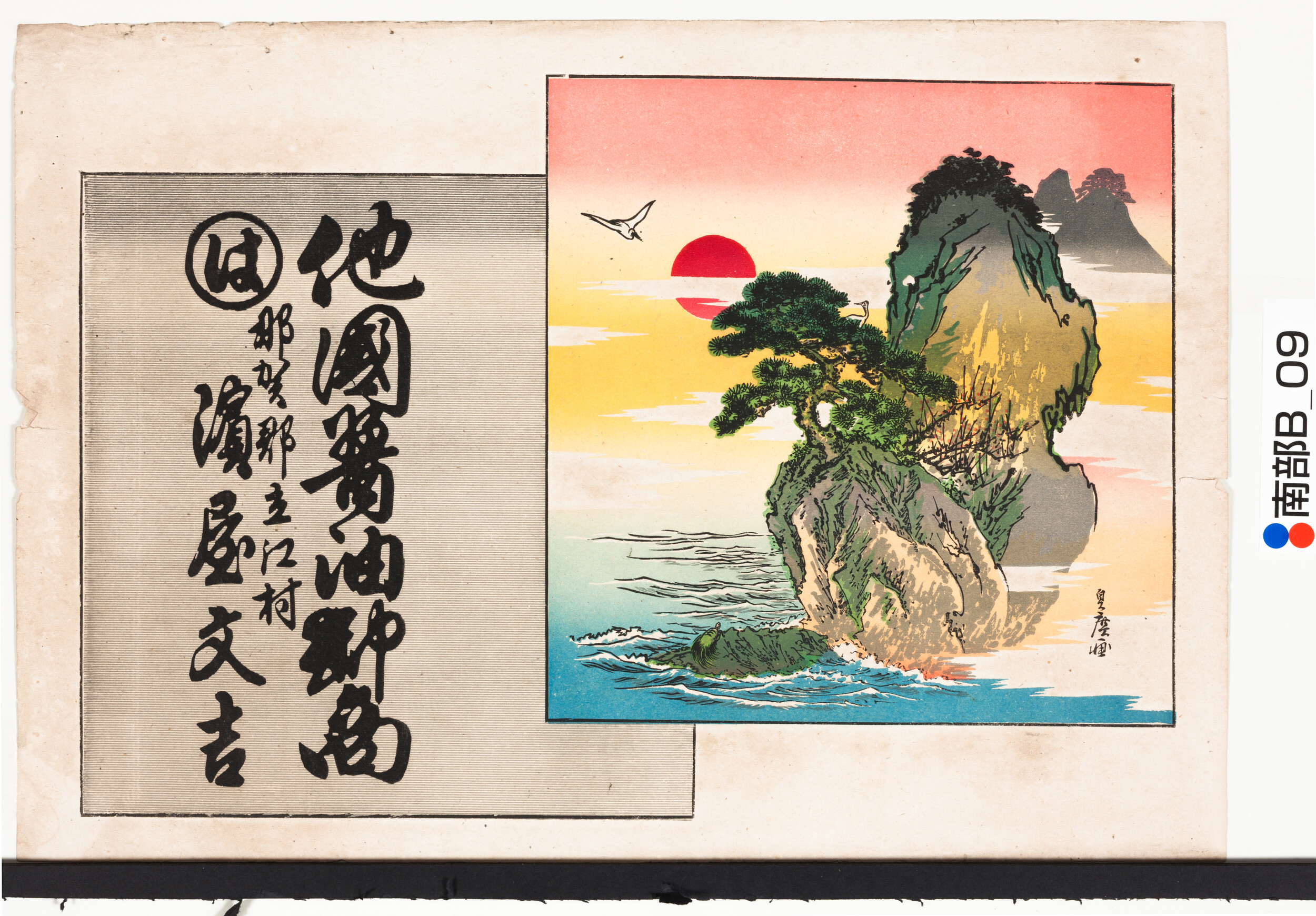 引札絵柄:大岩の松か 商店場所:那賀郡立江村 商店名称:浜屋文吉 商売内容:他国醤油卸商