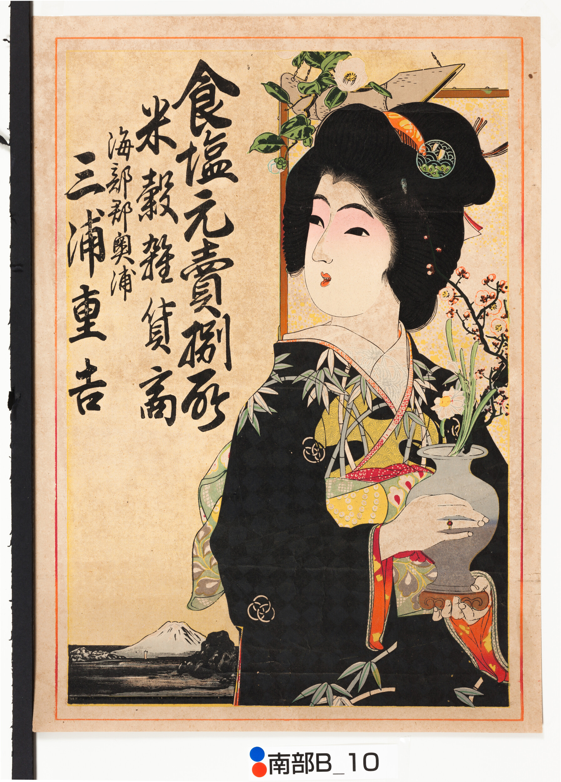 引札絵柄:花瓶を持つ女性 商店場所:海部郡奥浦 商店名称:三浦重吉 商売内容:食塩元売捌所 米穀雑貨商