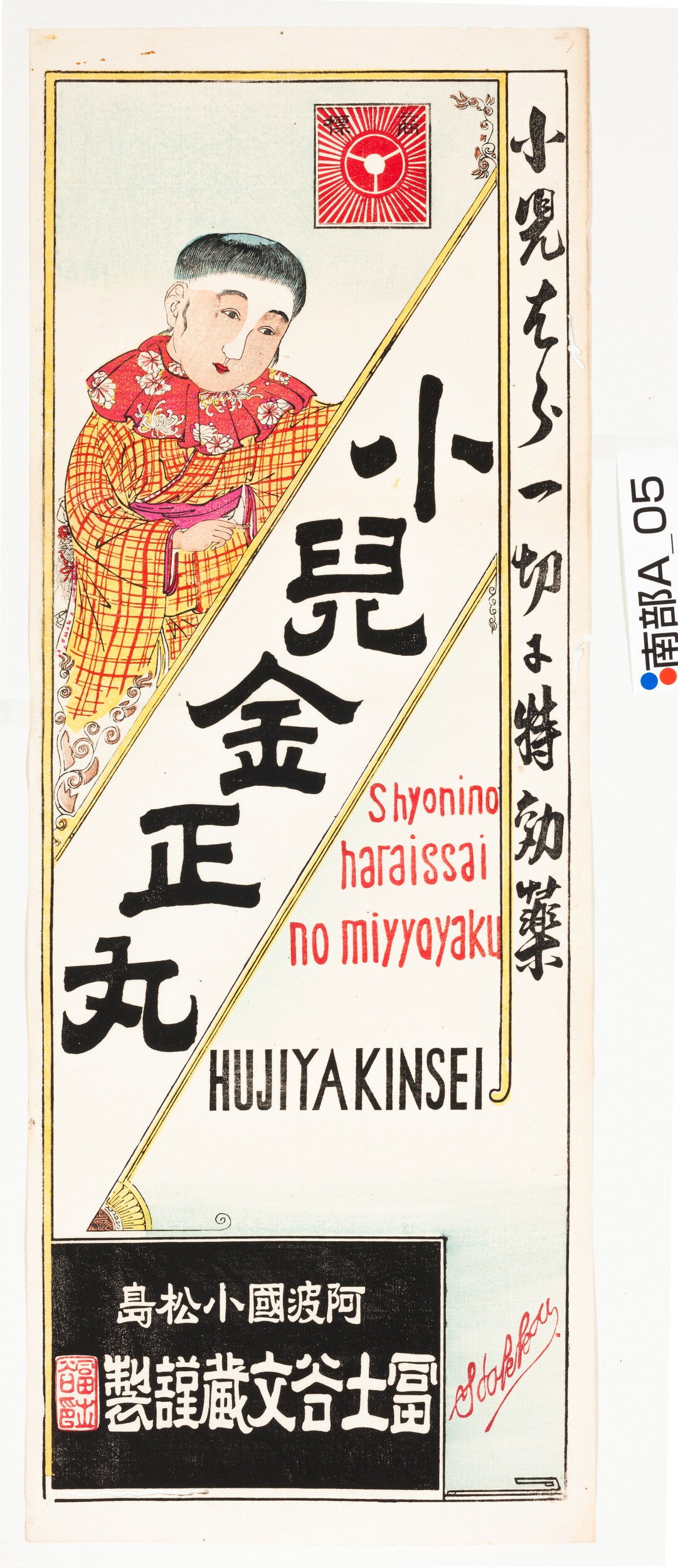引札絵柄:縦細長「小児はら一切に特効薬」 商店場所:阿波国小松島 商店名称:冨士谷文蔵 商売内容:薬 小児金正丸