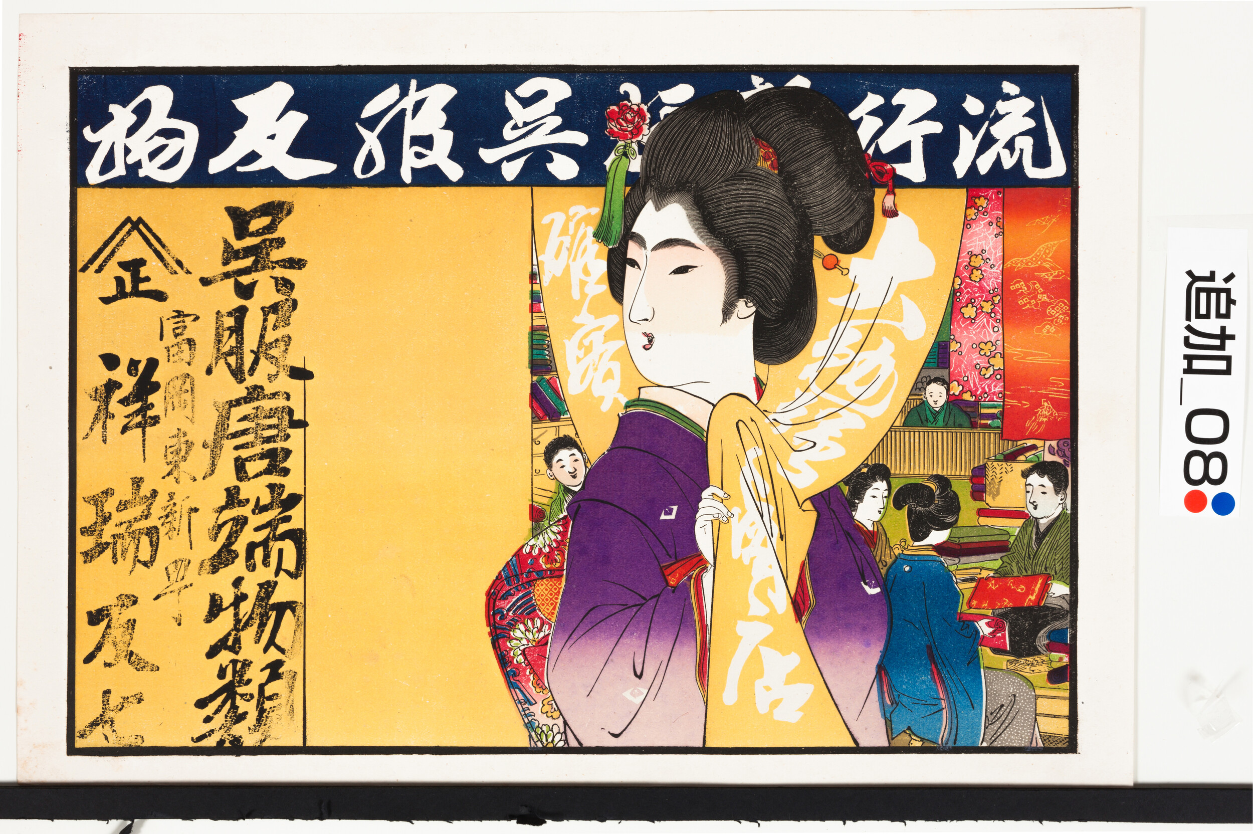 引札絵柄:呉服店の暖簾を持つ女性 商店場所:富岡東新町 商店名称:祥瑞友七 商売内容:呉服唐端物類