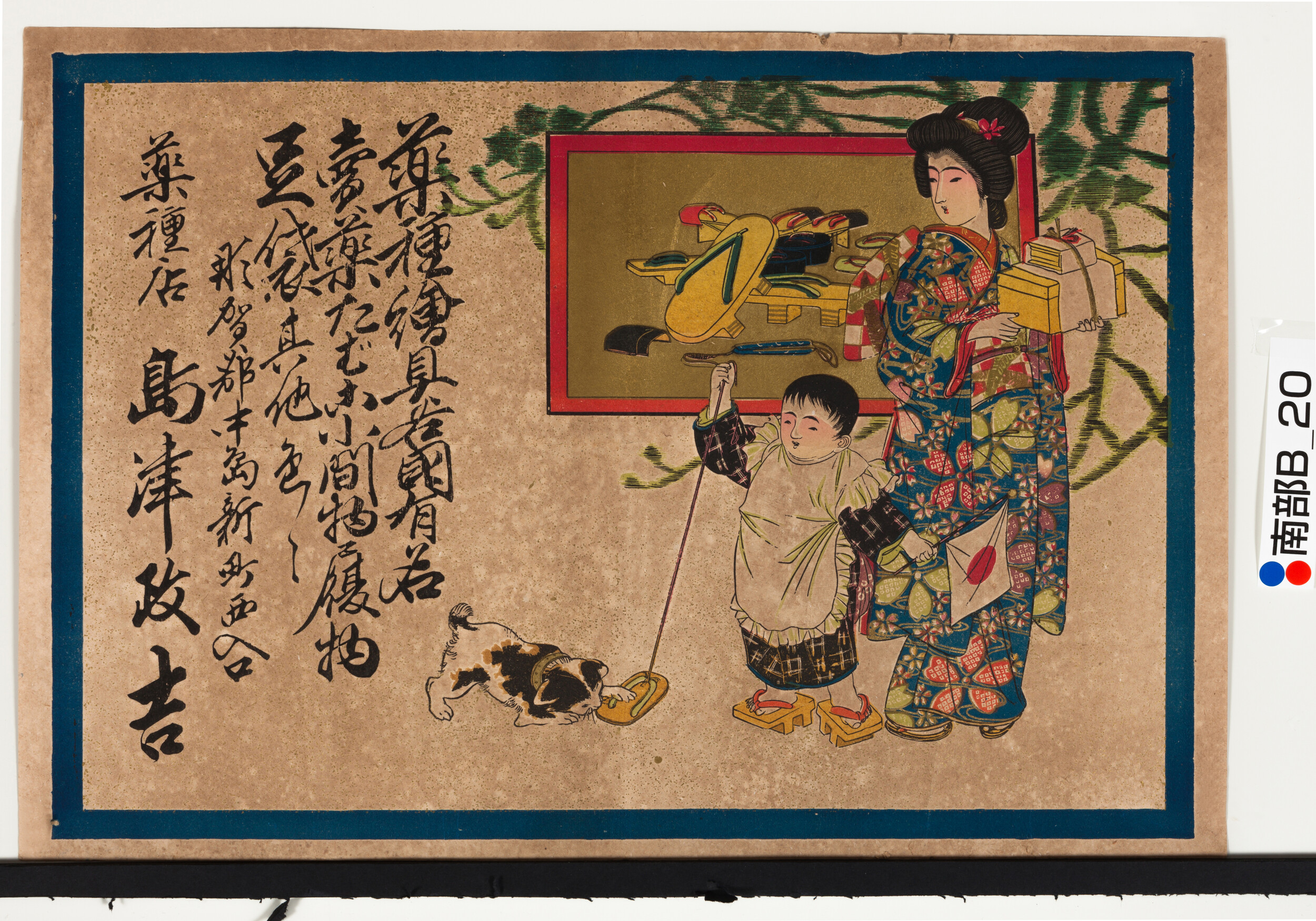 引札絵柄:母子と猫 履物の絵 商店場所:那賀郡中島新町西入口 商店名称:島津政吉 商売内容:薬種店