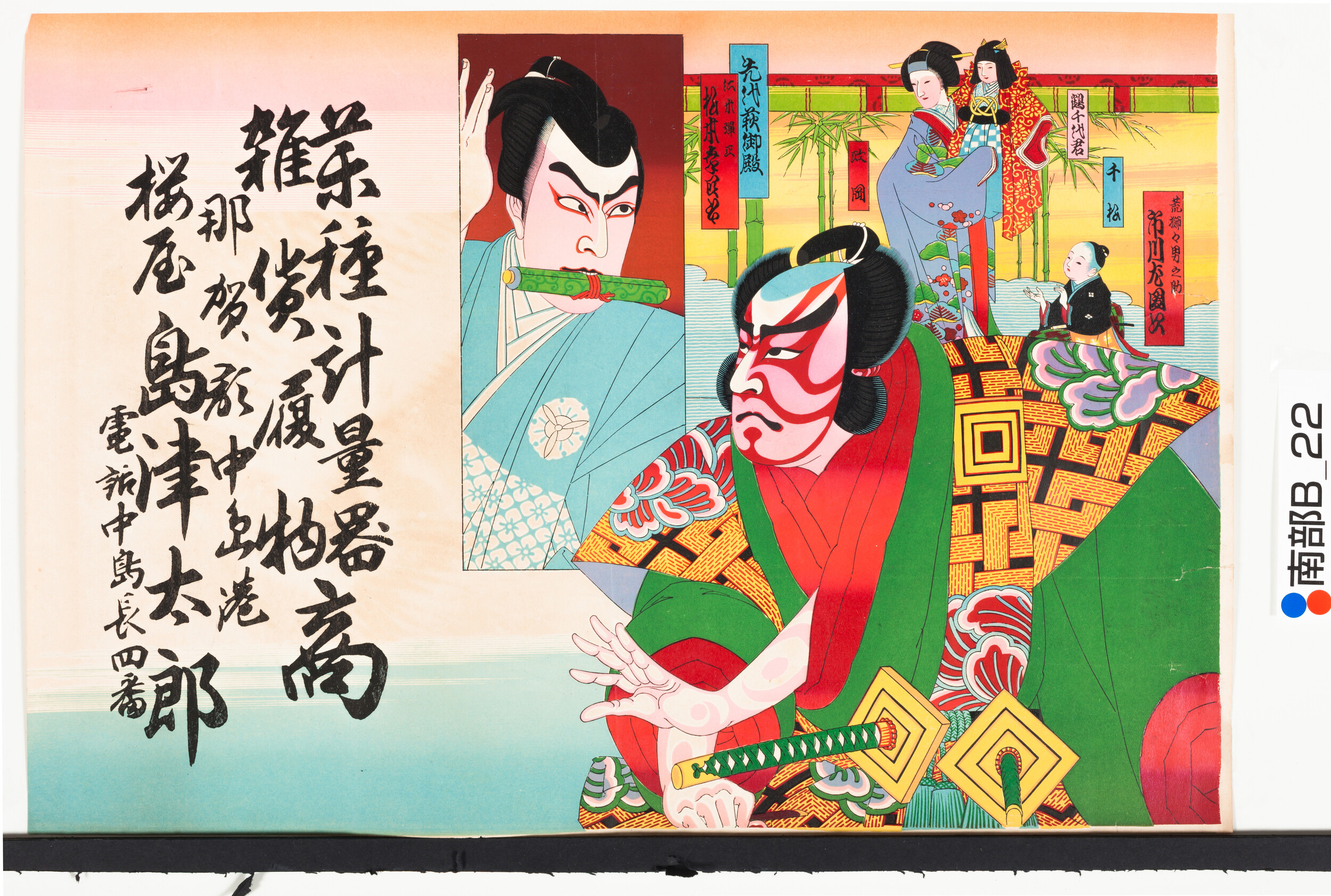 引札絵柄:歌舞伎先代萩の場面 商店場所:那賀郡中島港 商店名称:桜屋 島津太郎 商売内容:薬種計量器 雑貨履物商