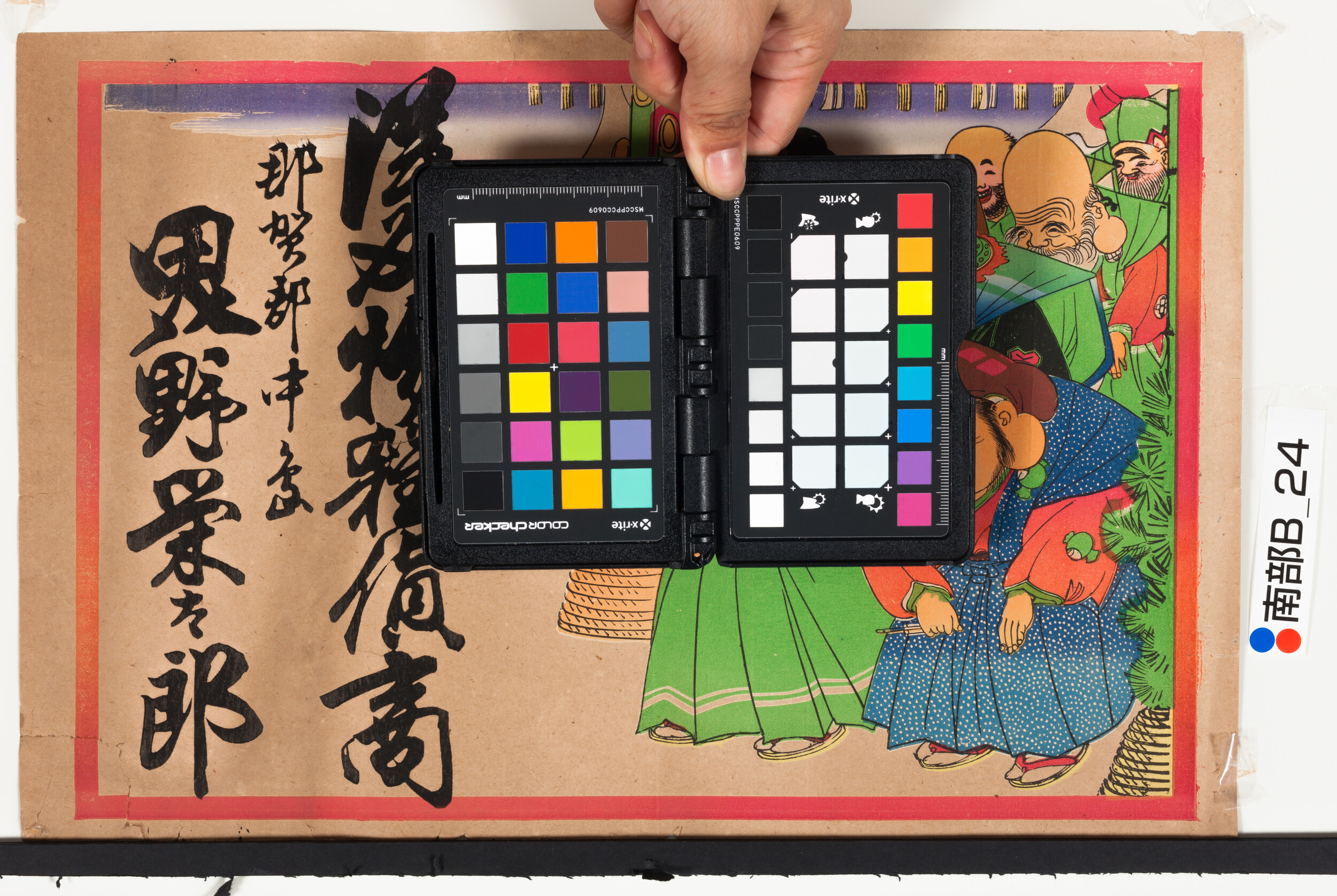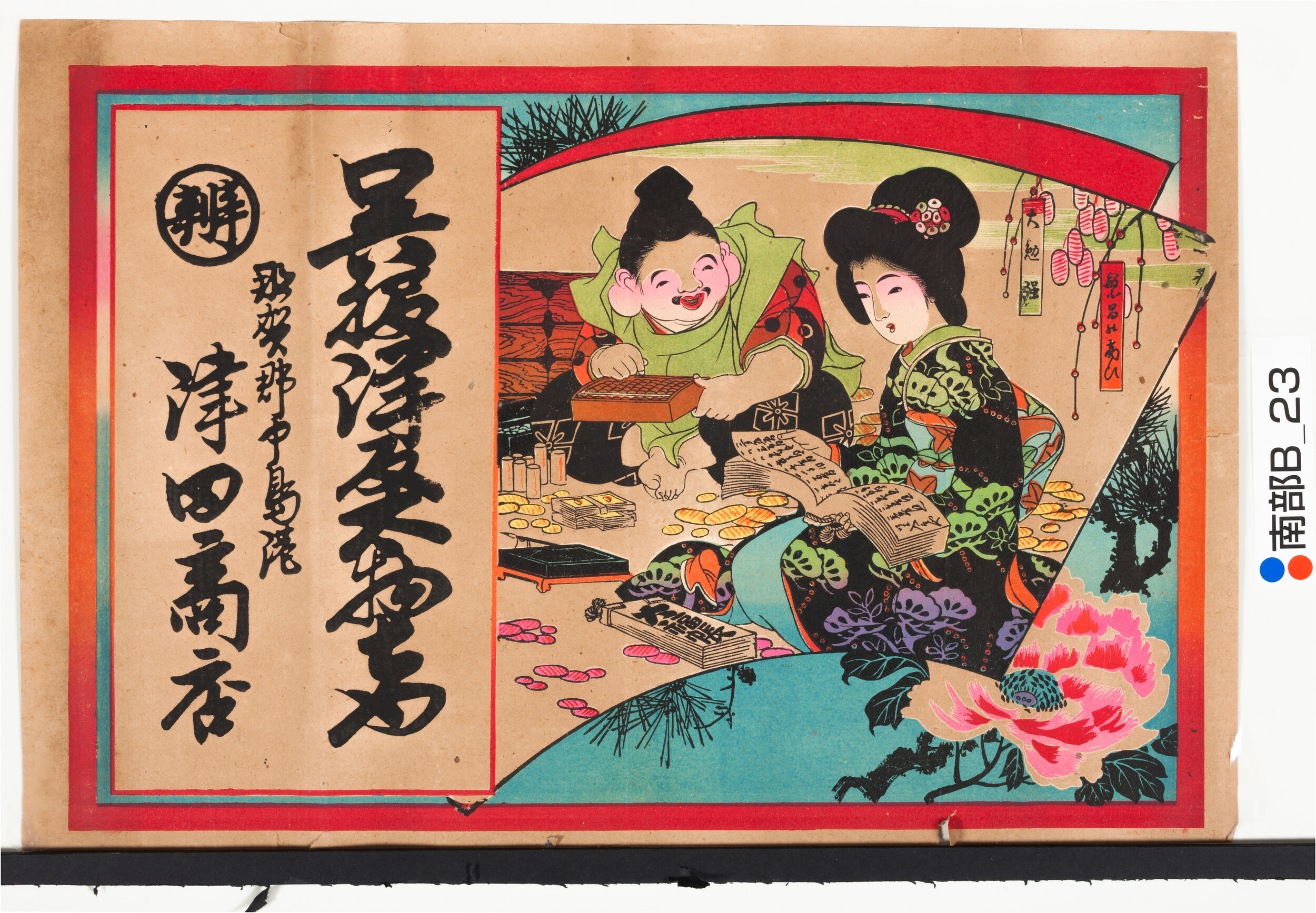 引札絵柄:七福神の年始挨拶 商店場所:那賀郡中島 商店名称:界野栄太郎 商売内容:洋反物雑貨商