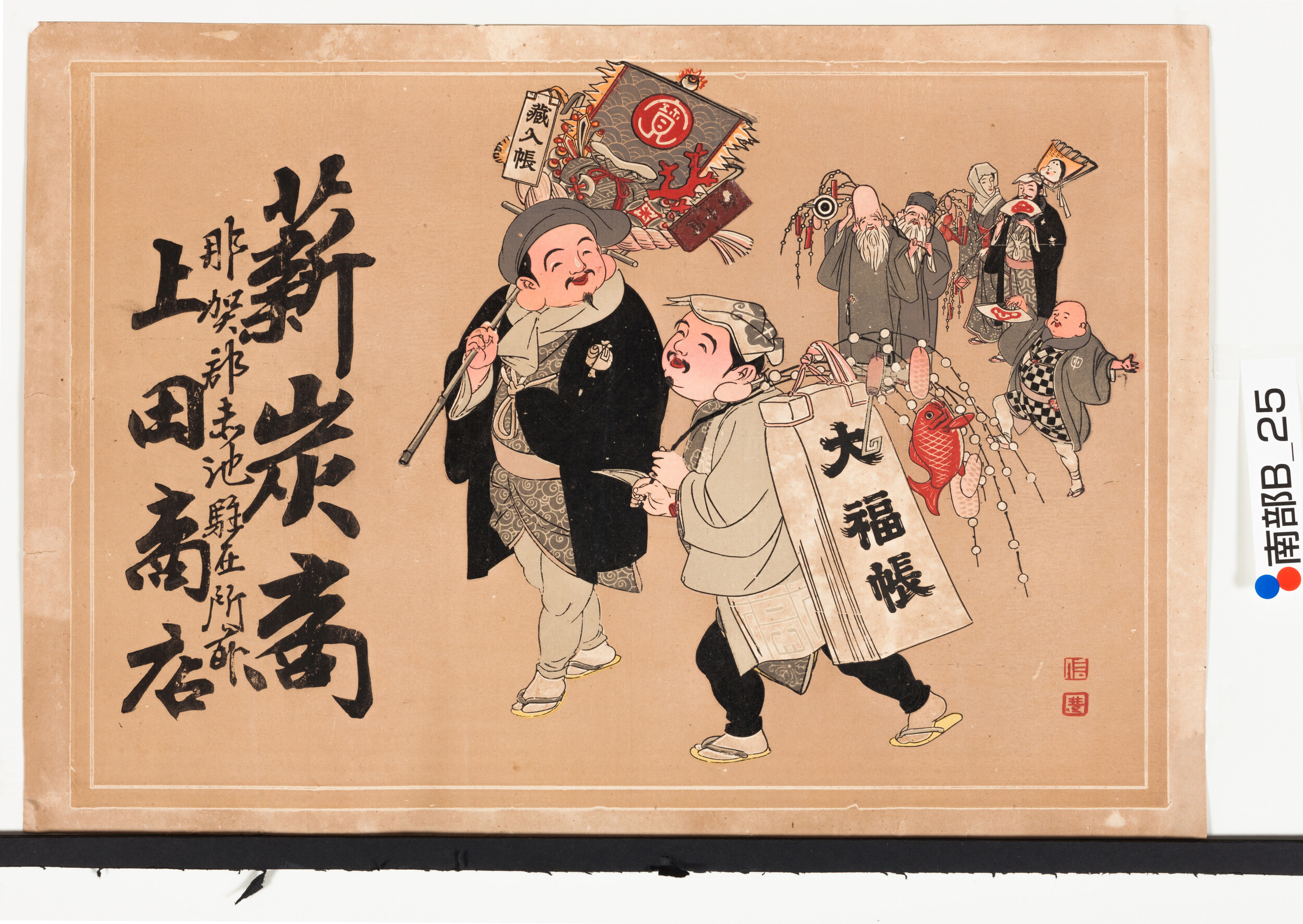 引札絵柄:福笹を担いだ七福神 商店場所:那賀郡赤池駐在所前 商店名称:上田商店 商売内容:薪炭商