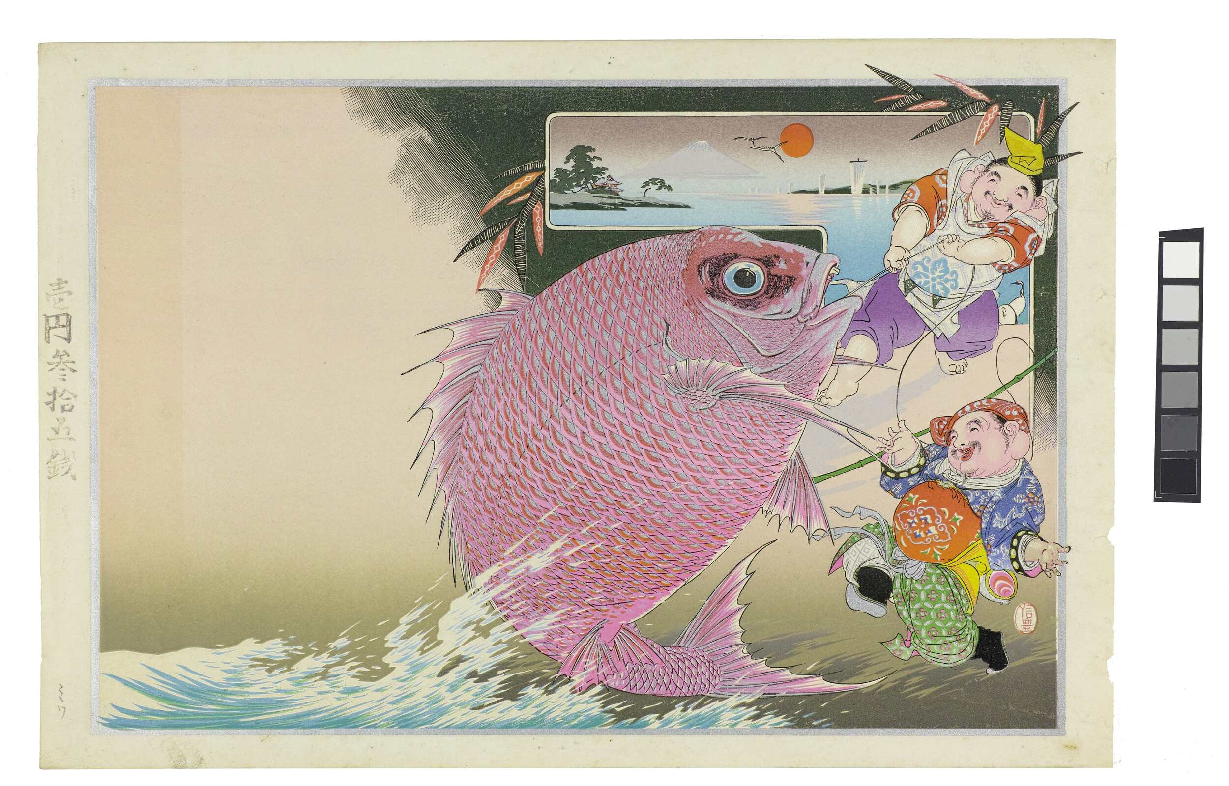 引札(名入れ前)大鯛を釣り上げる恵比寿、喜ぶ大黒