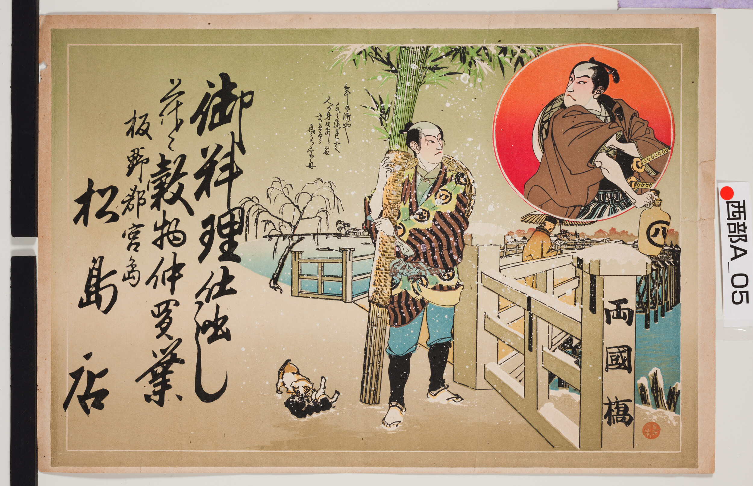 引札絵柄:大高源吾 赤垣源蔵 其角 商店場所:板野郡宮島 商店名称:松島店 商売内容:御料理仕出し并ニ穀物仲買業