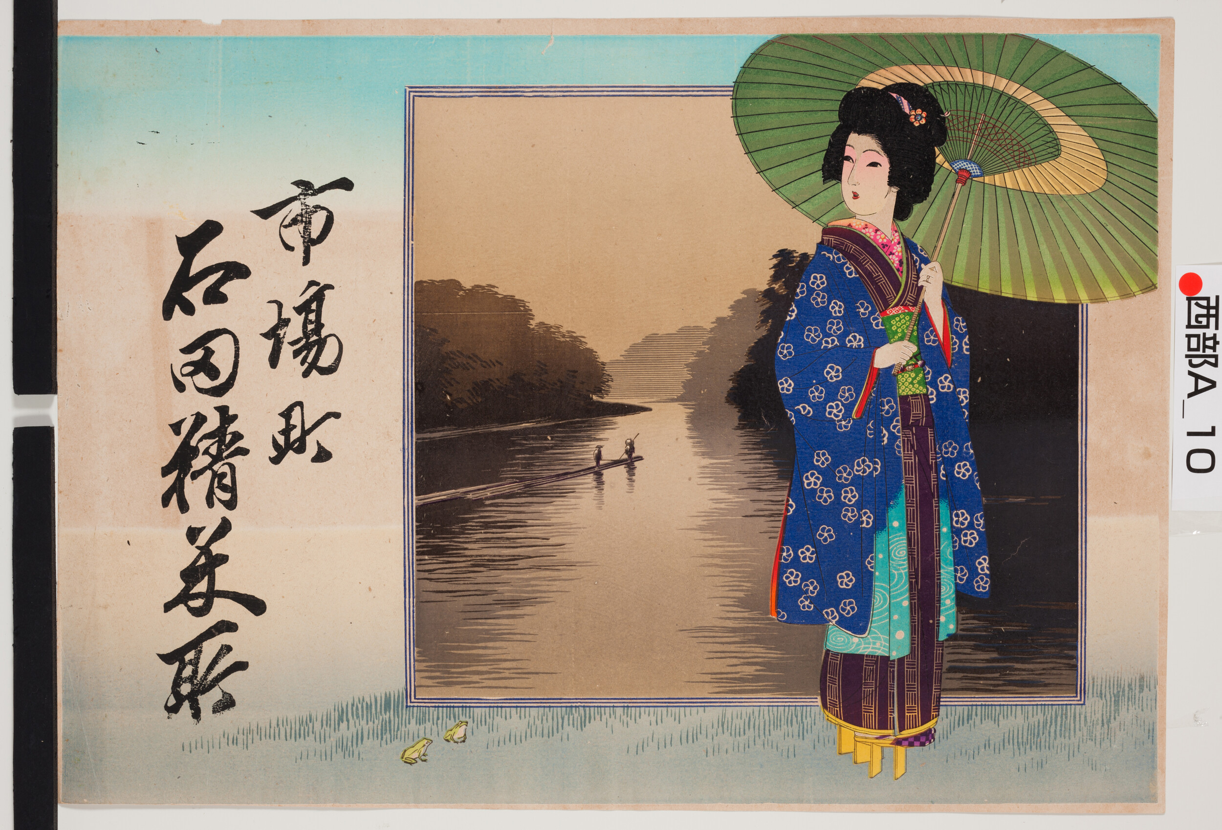 引札絵柄:高下駄を履いて傘をさす女人 商店場所:市場町 商店名称:石田精米所 商売内容:精米