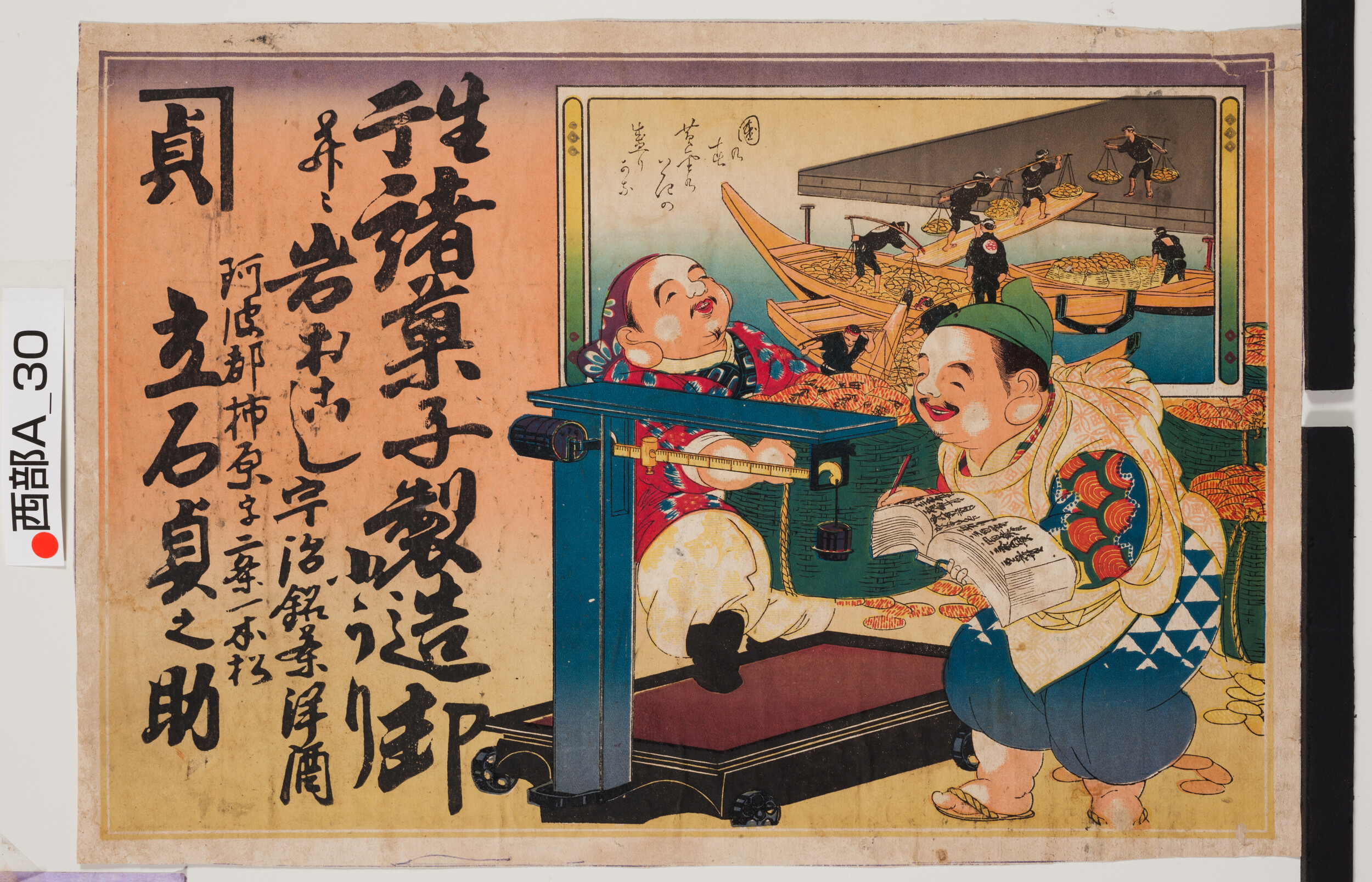 引札絵柄:鯛の上に乗る恵比寿 商店場所:板野郡大津村 商店名称:尾形善吉 商売内容:竹荒物并ニ学校用品