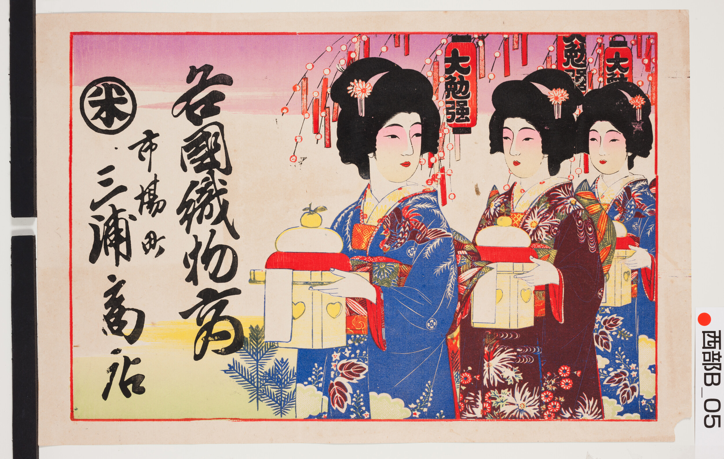 引札絵柄:鏡餅飾りを持つ三人の美女 商店場所:市場町 商店名称:三浦商店 商売内容:各国織物商