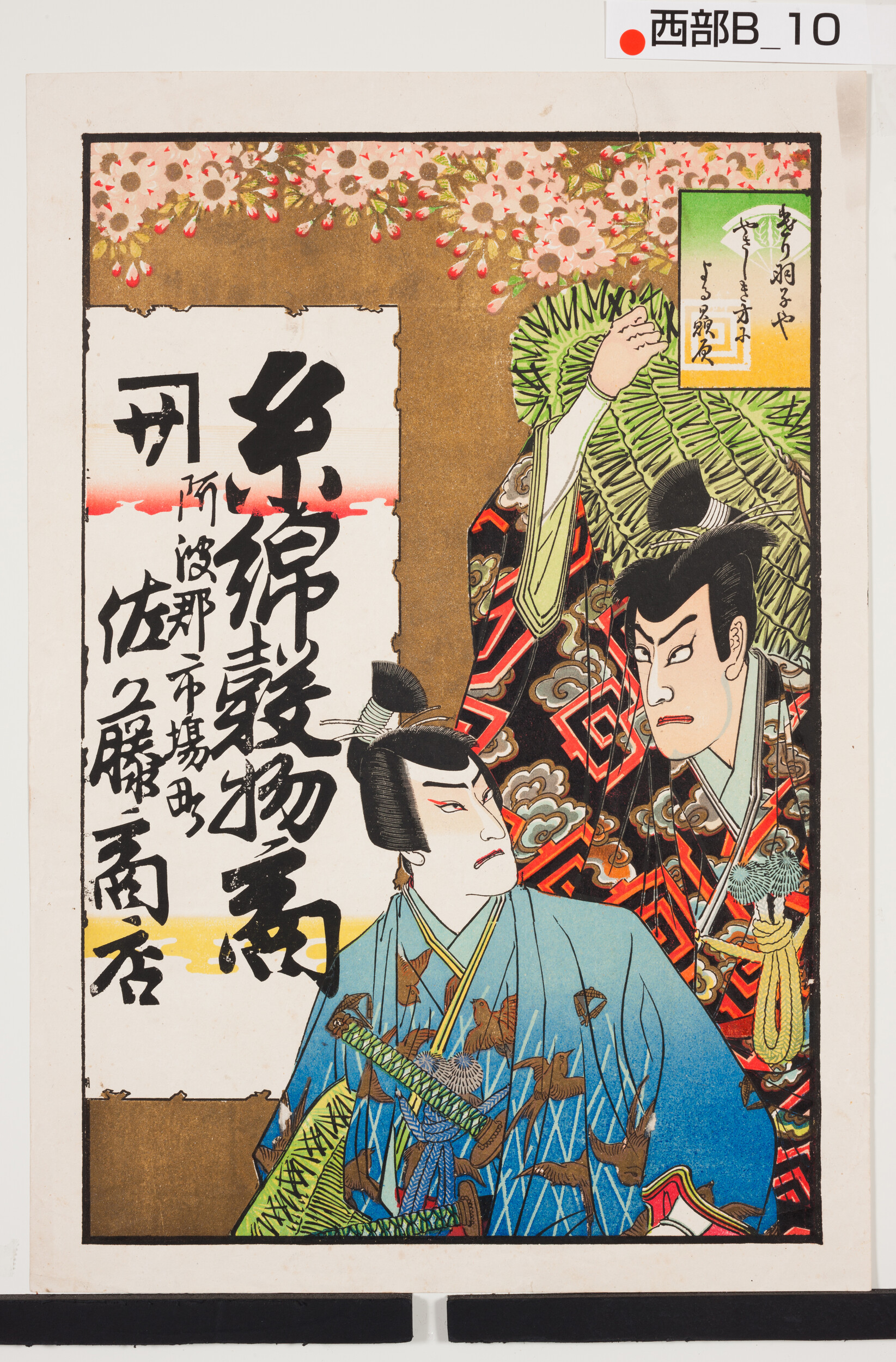 引札絵柄:歌舞伎役者 「遣羽子ややさしき方による贔屓」 商店場所:阿波郡市場町 商店名称:佐藤商店 商売内容:糸綿穀物商