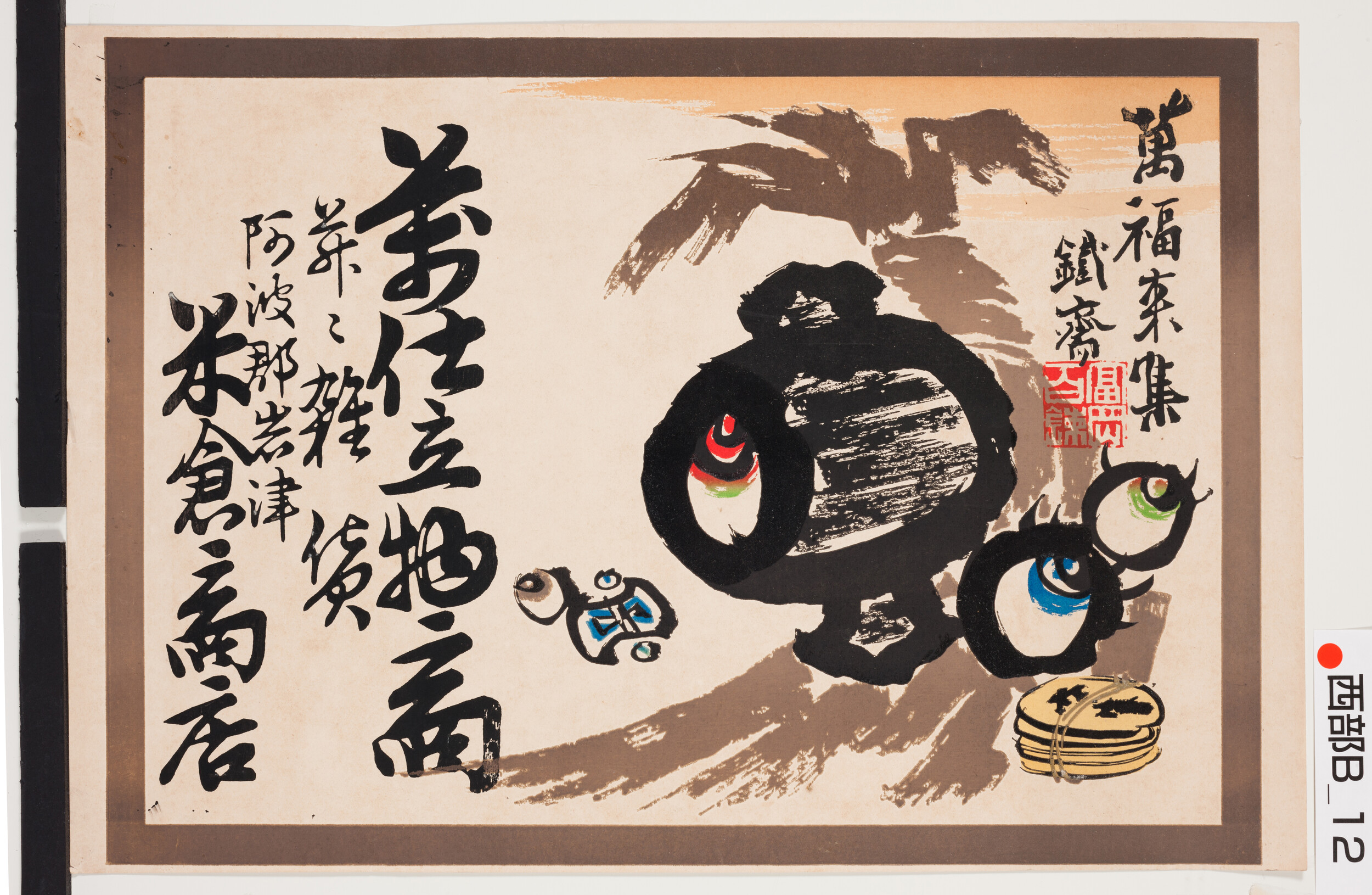 引札絵柄:萬福来集 打ち出の小槌 宝珠 商店場所:阿波郡岩津 商店名称:米倉商店 商売内容:萬仕立物并ニ雑貨商