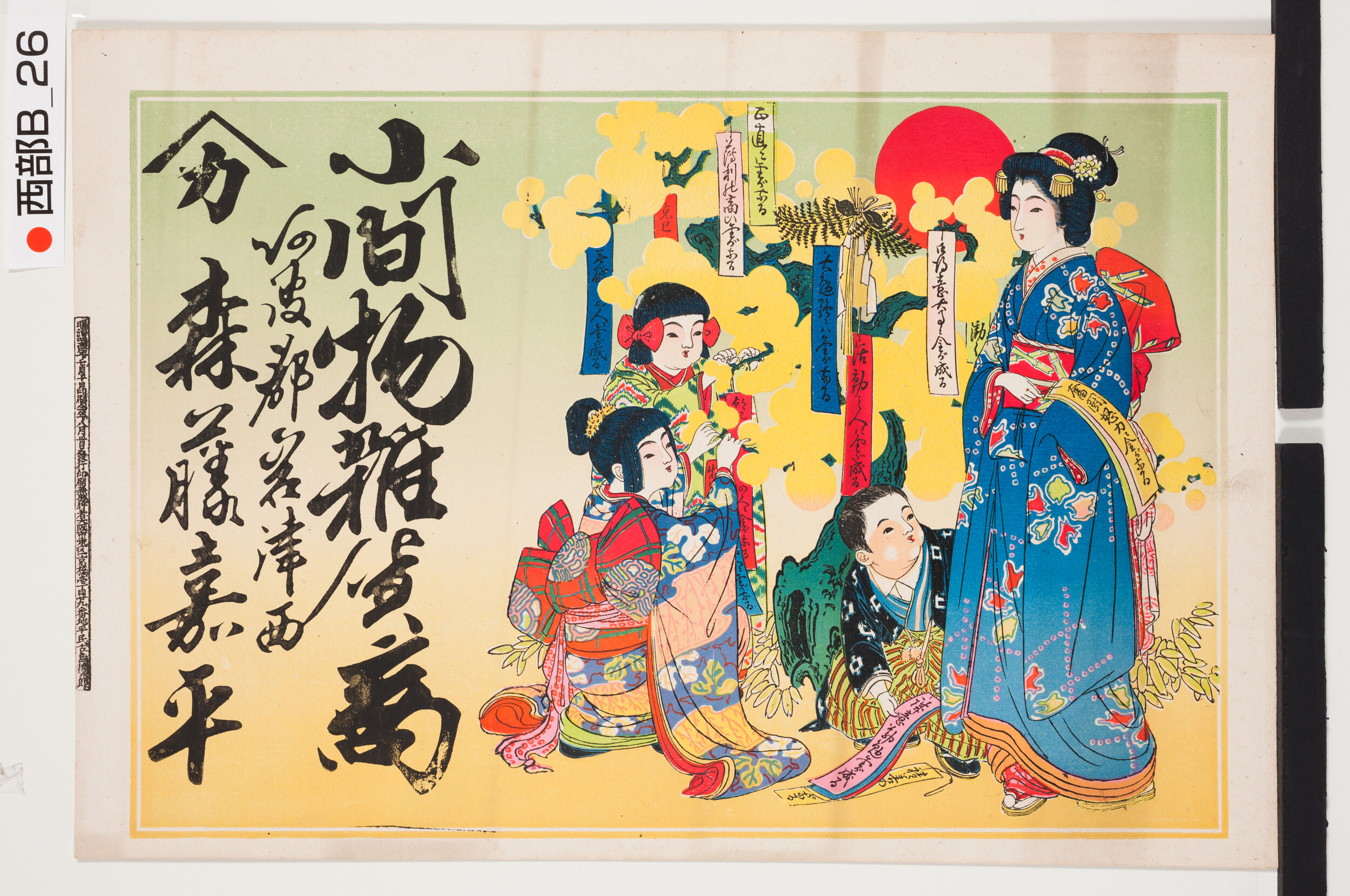 引札絵柄:短冊を飾り付ける母子 商店場所:阿波郡岩津西 商店名称:森藤嘉平 商売内容:小間物雑貨商