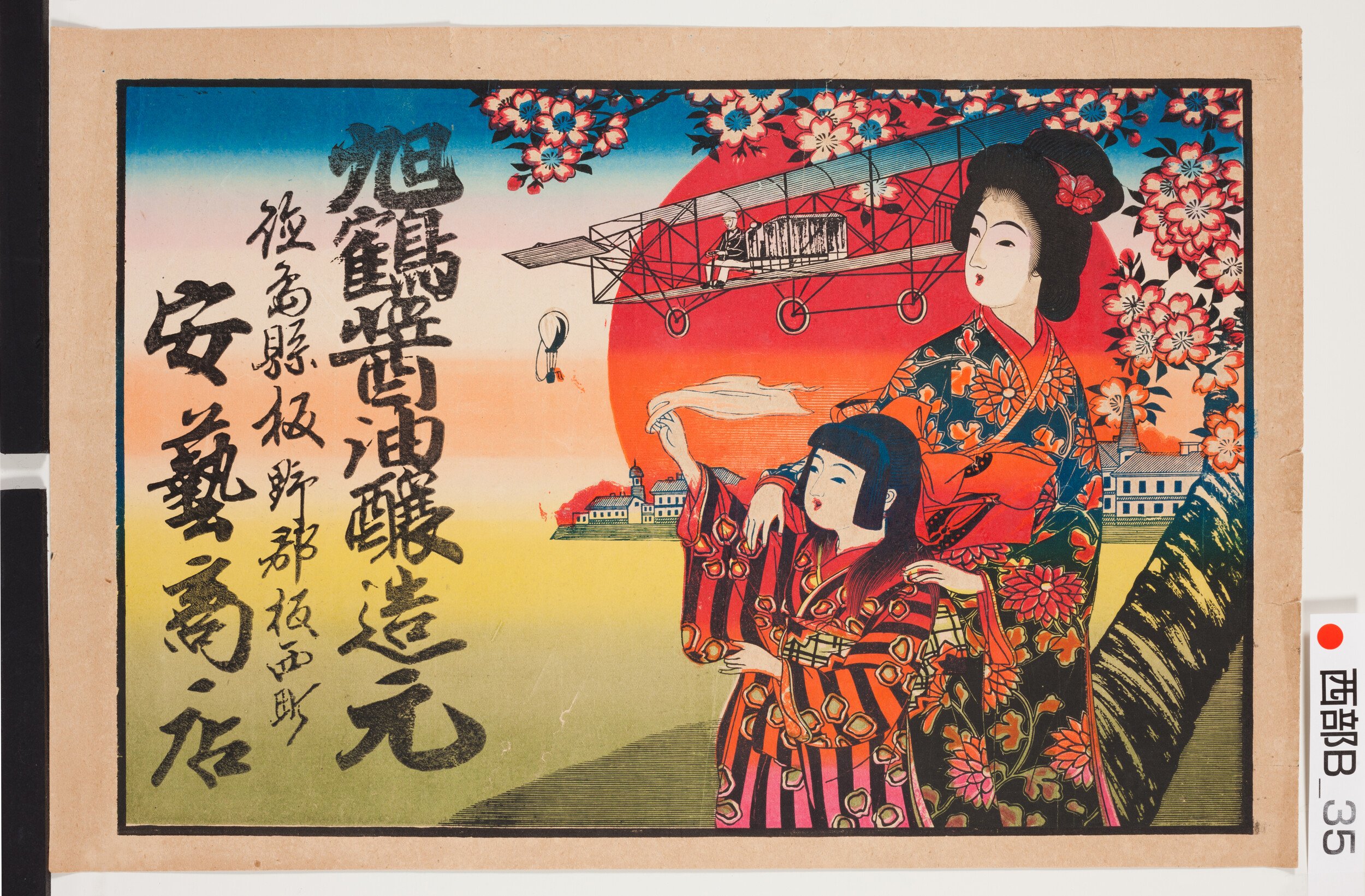 引札絵柄:飛行機に手を振る母子 商店場所:徳島県板野郡板西町 商店名称:安藝商店 商売内容:旭鶴醤油醸造元
