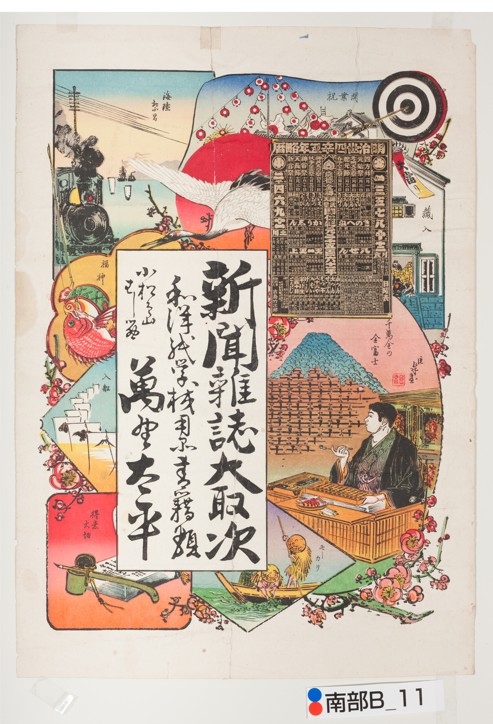 引札絵柄:明治34年略暦 縁起物など 商店場所:小松島 商店名称:萬野太平 商売内容:新聞雑誌大取次 和洋紙学校用品書籍類