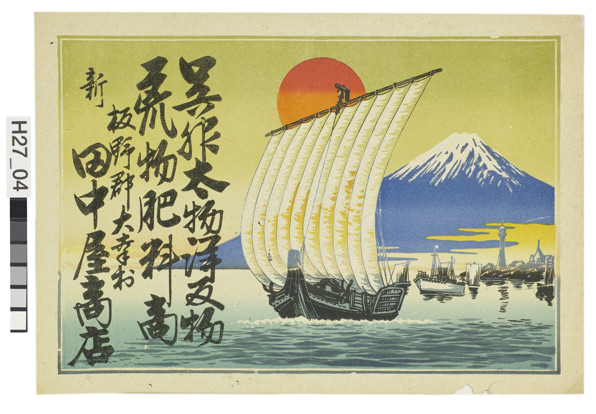 引札絵柄:富士山・帆掛け船 商店場所:板野郡大幸村 商店名称:田中屋商店 商売内容:呉服太物洋反物荒物肥料商
