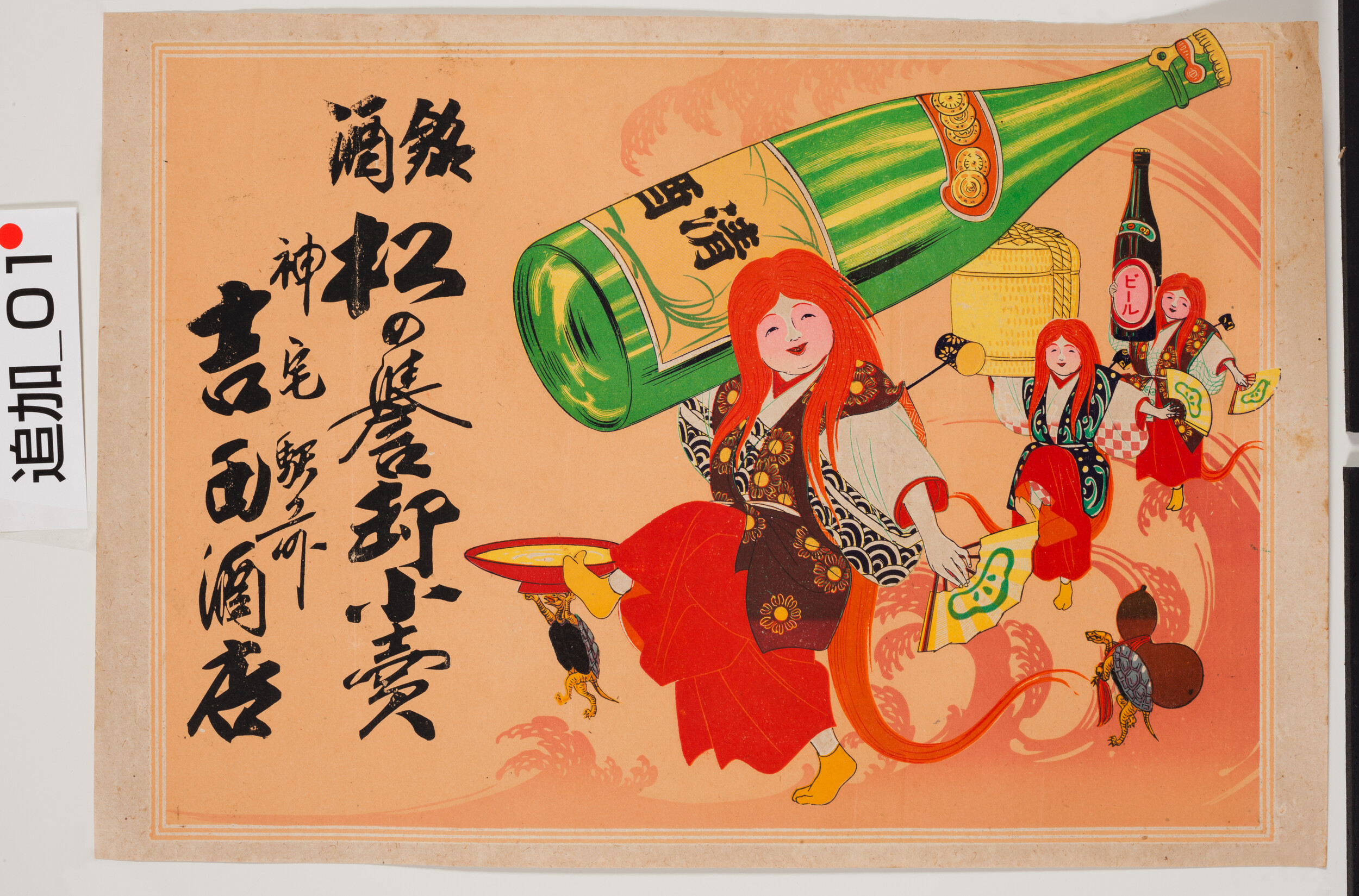 引札絵柄:酒を担いだ猩々と亀 商店場所:神宅駅前 商店名称:吉田酒店 商売内容:松の誉卸小売
