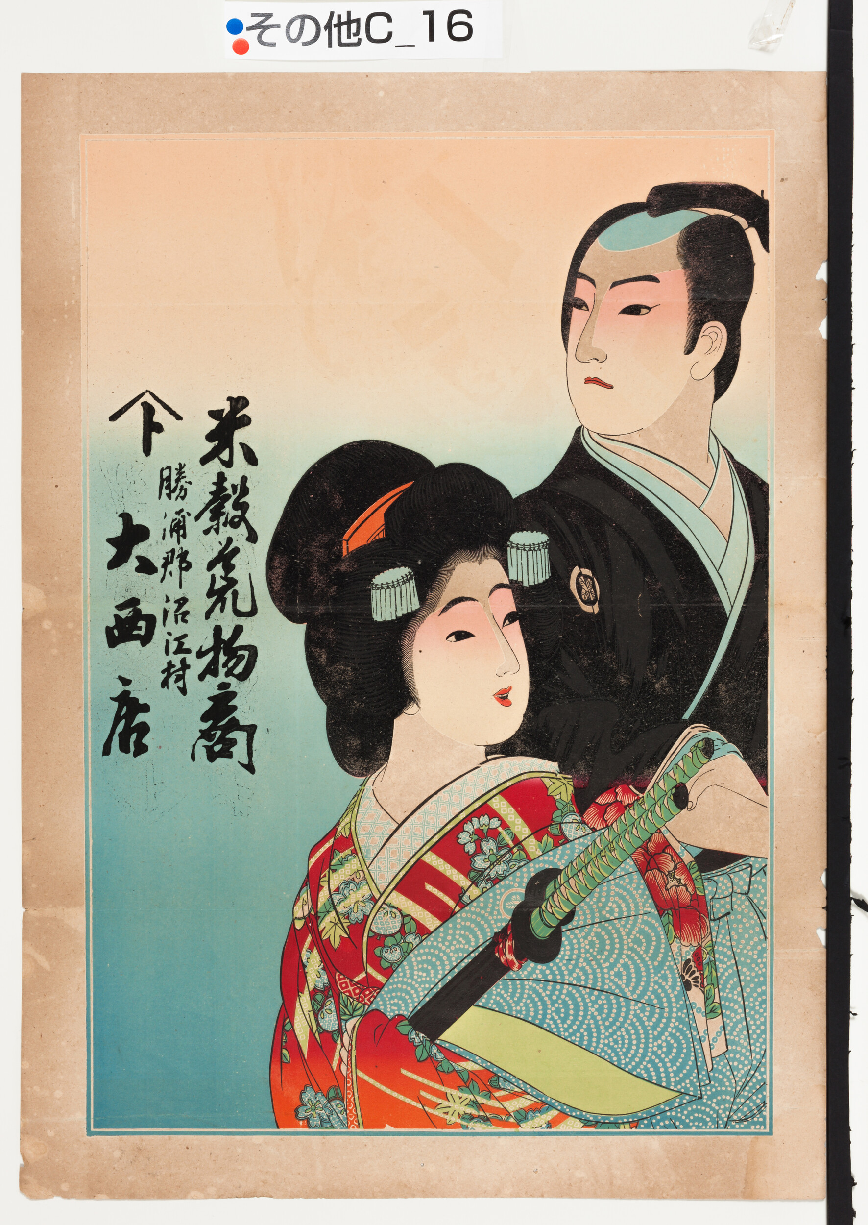 引札絵柄:歌舞伎絵か 商店場所:勝浦郡沼江村 商店名称:大西店 商売内容:米穀荒物商
