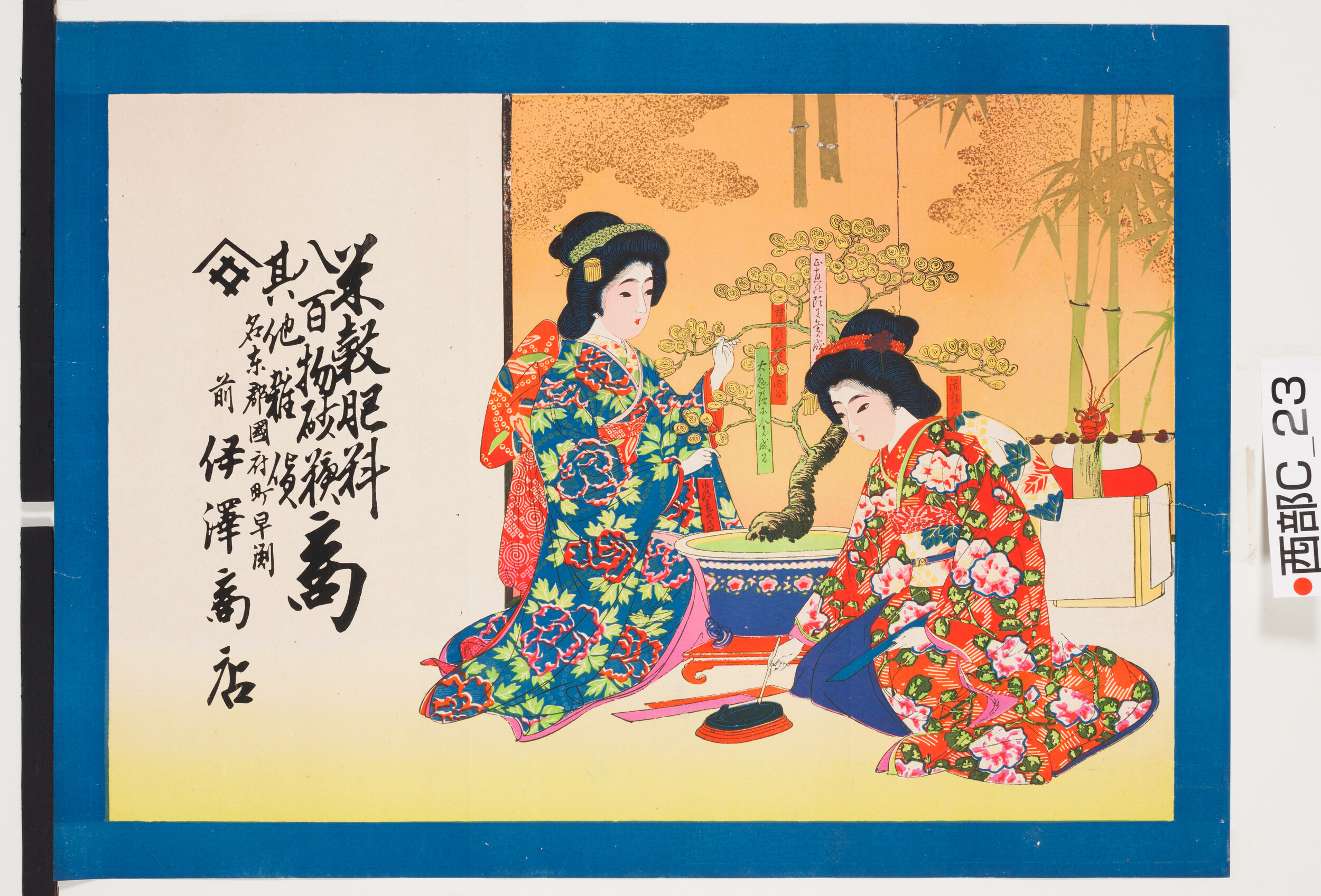 引札絵柄:正月飾りの短冊を書く女性 商店場所:名東郡国府町早渕 商店名称:前 井沢商店 商売内容:米穀肥料八百物砂糖その他雑貨商