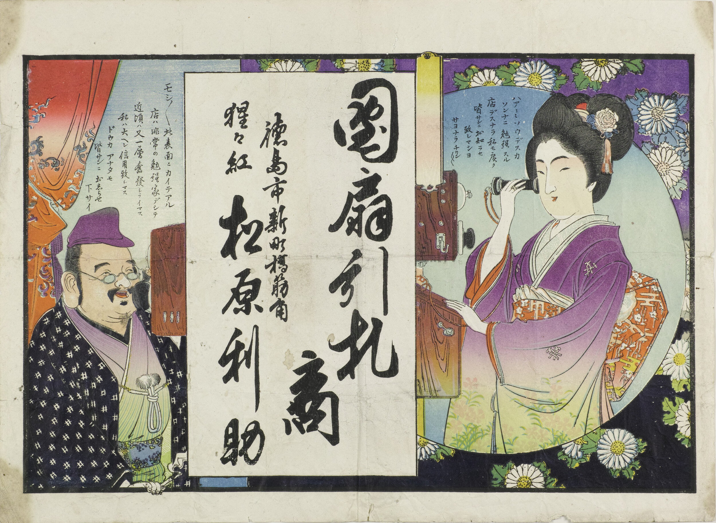 引札絵柄:電話で会話する店主と客 商店場所:徳島市新町橋筋角 商店名称:猩々紅 松原利助 商売内容:団扇引札商