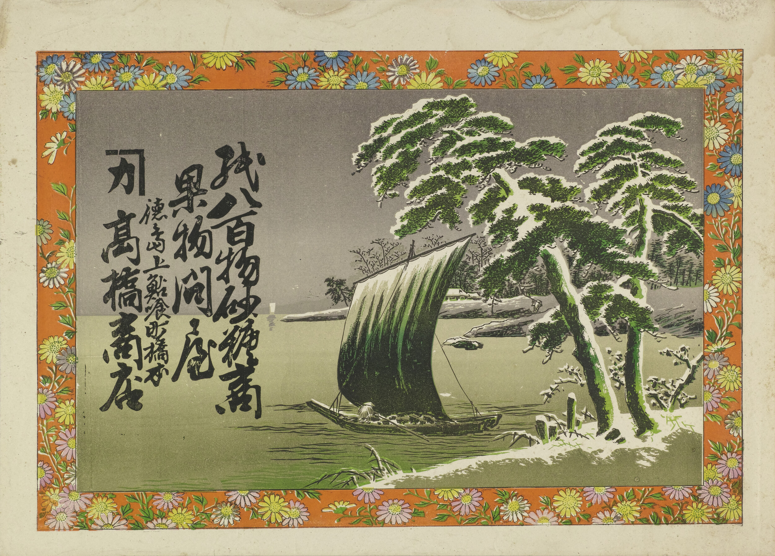 引札絵柄:雪景色の中帆掛け船 商店場所:徳島上鮎喰町橋本 商店名称:高橋商店 商売内容:紙八百物砂糖商果物問屋