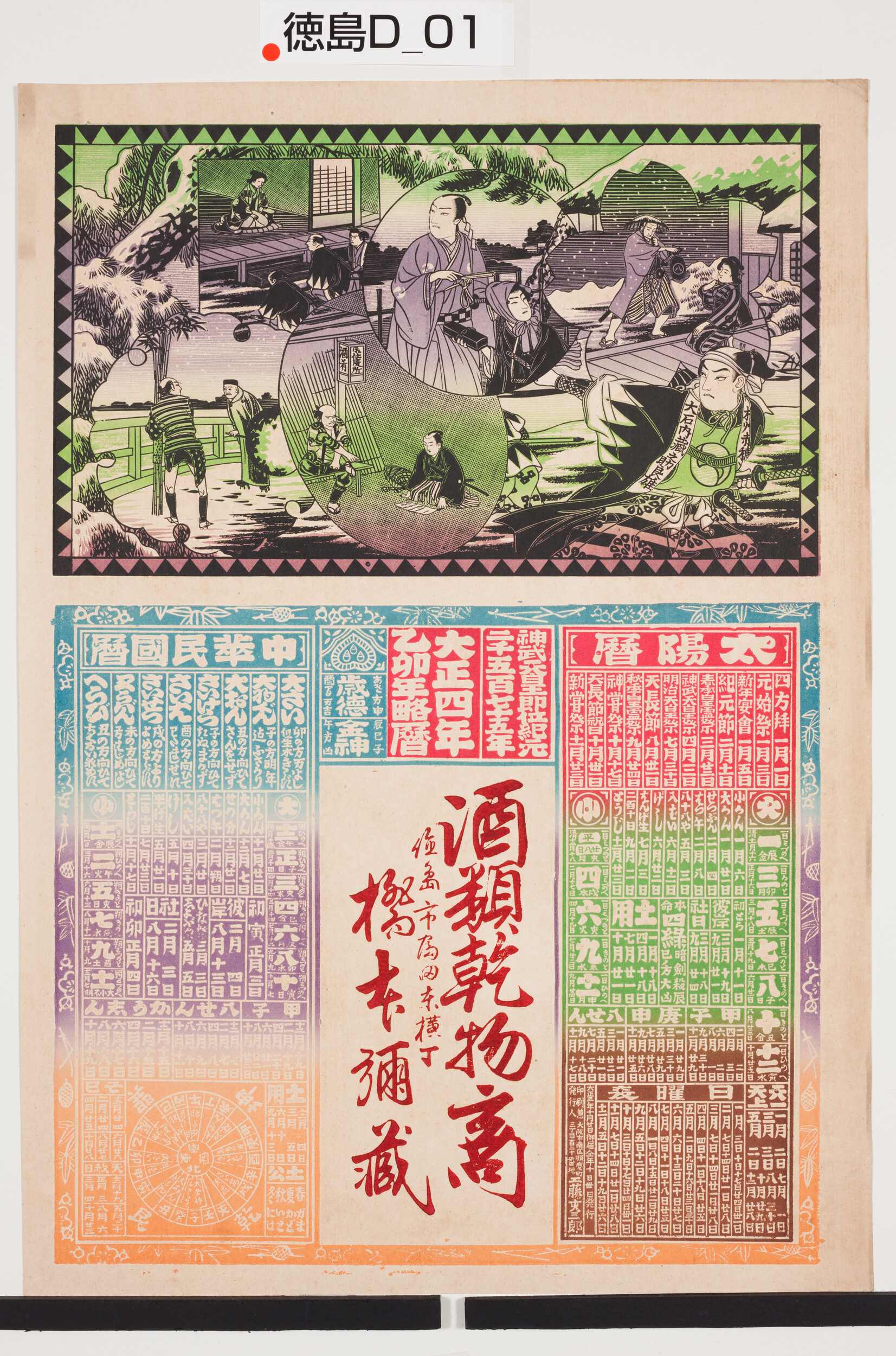 引札絵柄:大正4年乙卯年略暦 忠臣蔵 商店場所:徳島市富田東横町 商店名称:橋本弥蔵 商売内容:酒類乾物商