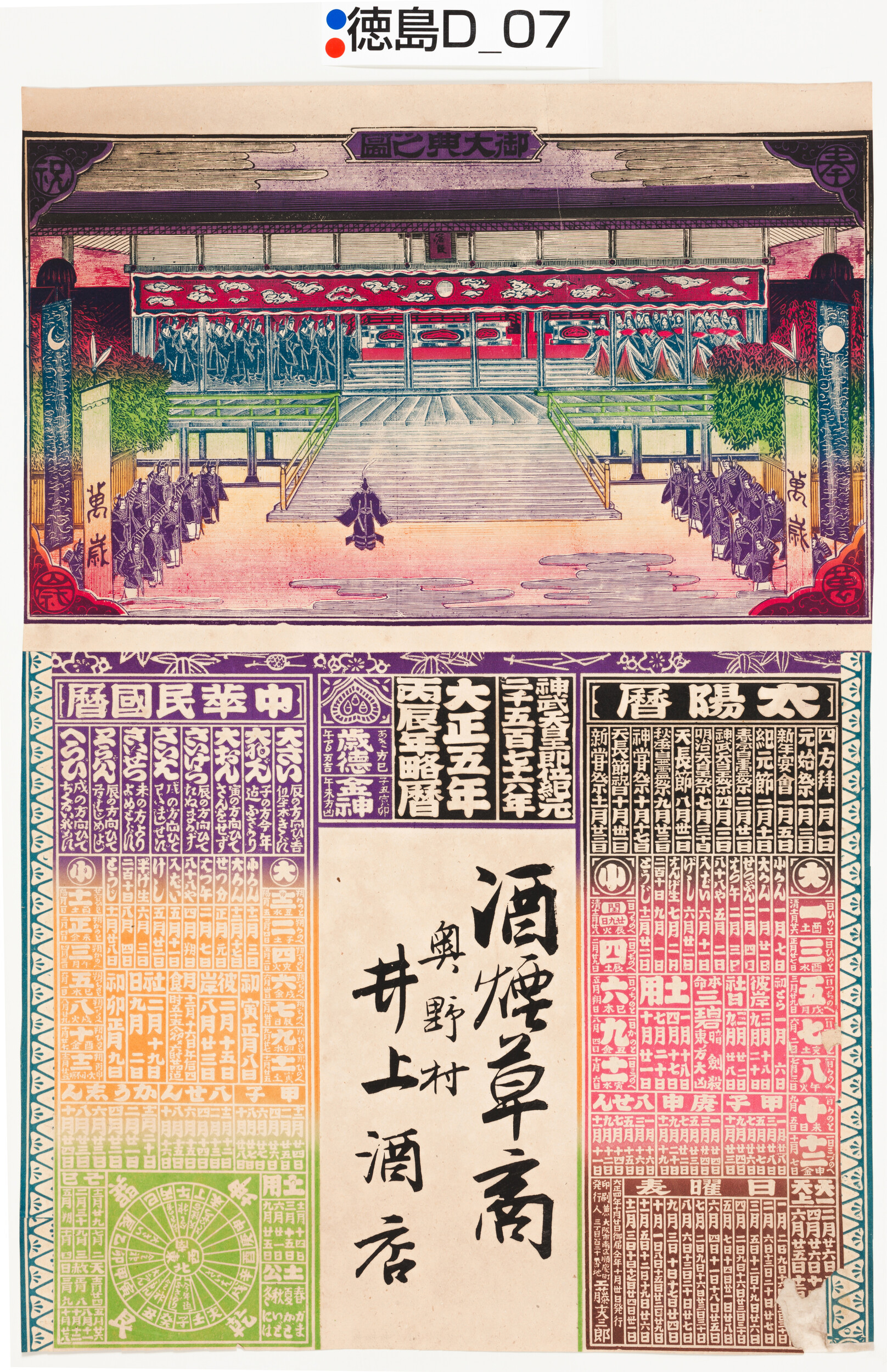 引札絵柄:大正5年丙辰年略暦 商店場所:奥野村 商店名称:井上酒店 商売内容:酒煙草商