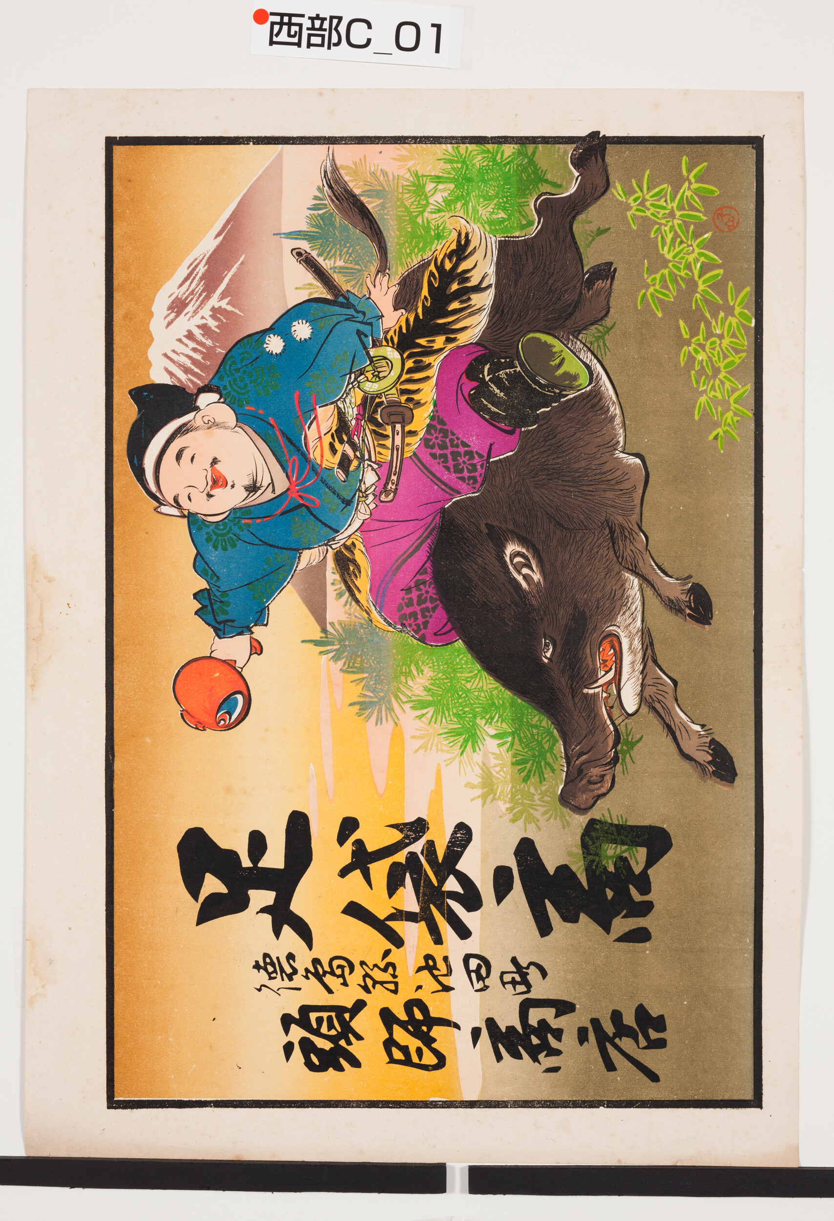 引札絵柄:猪に乗った恵比寿 商店場所:徳島県池田町 商店名称:頭師商店 商売内容:足袋商