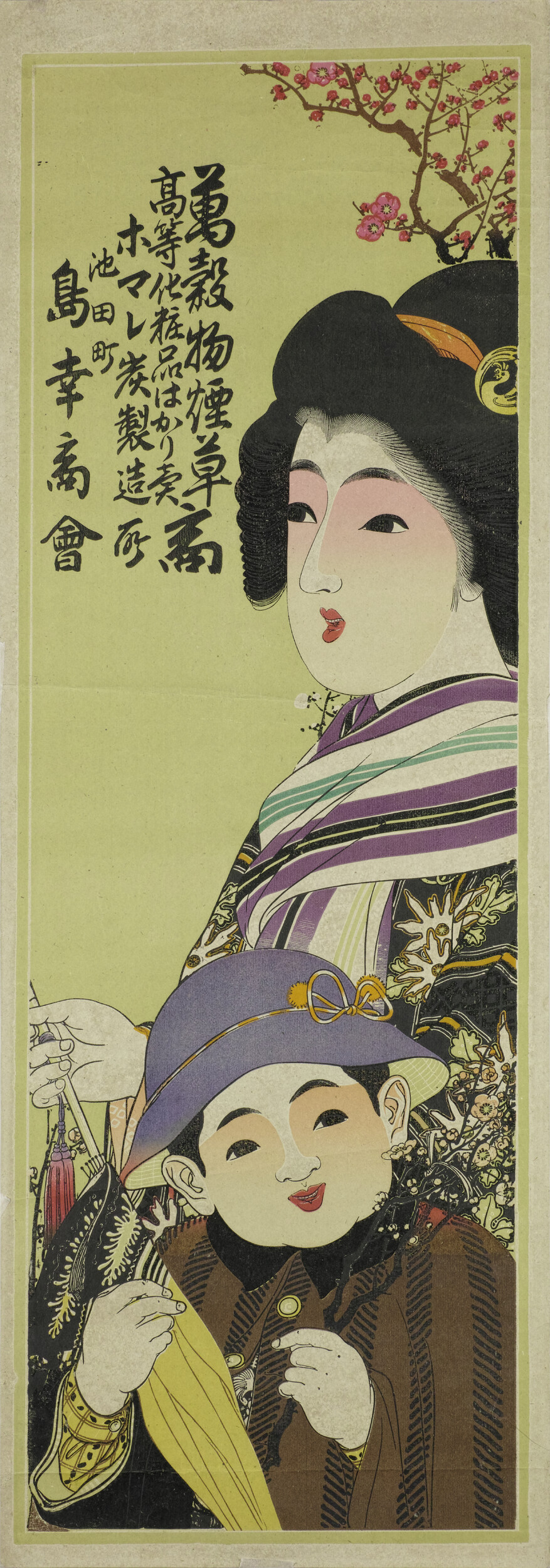 引札絵柄:洋傘を持つ母子 商店場所:池田町 商店名称:島幸商会 商売内容:萬穀物煙草高等化粧品はかり売商 ホマレ炭製造所