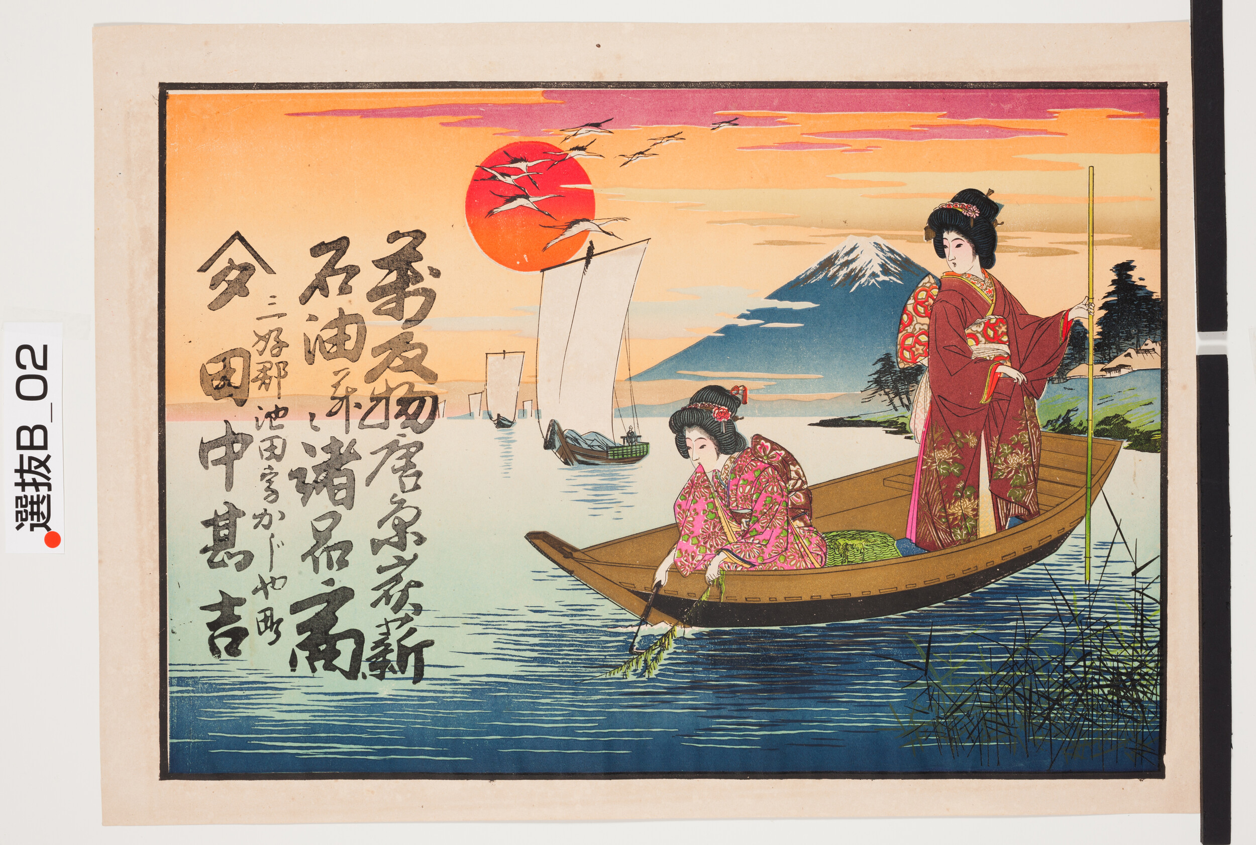 引札絵柄:船上の美女 鶴 商店場所:麻植郡舩戸 商店名称:岡田楼 商売内容:酒類 御料理 御宿
